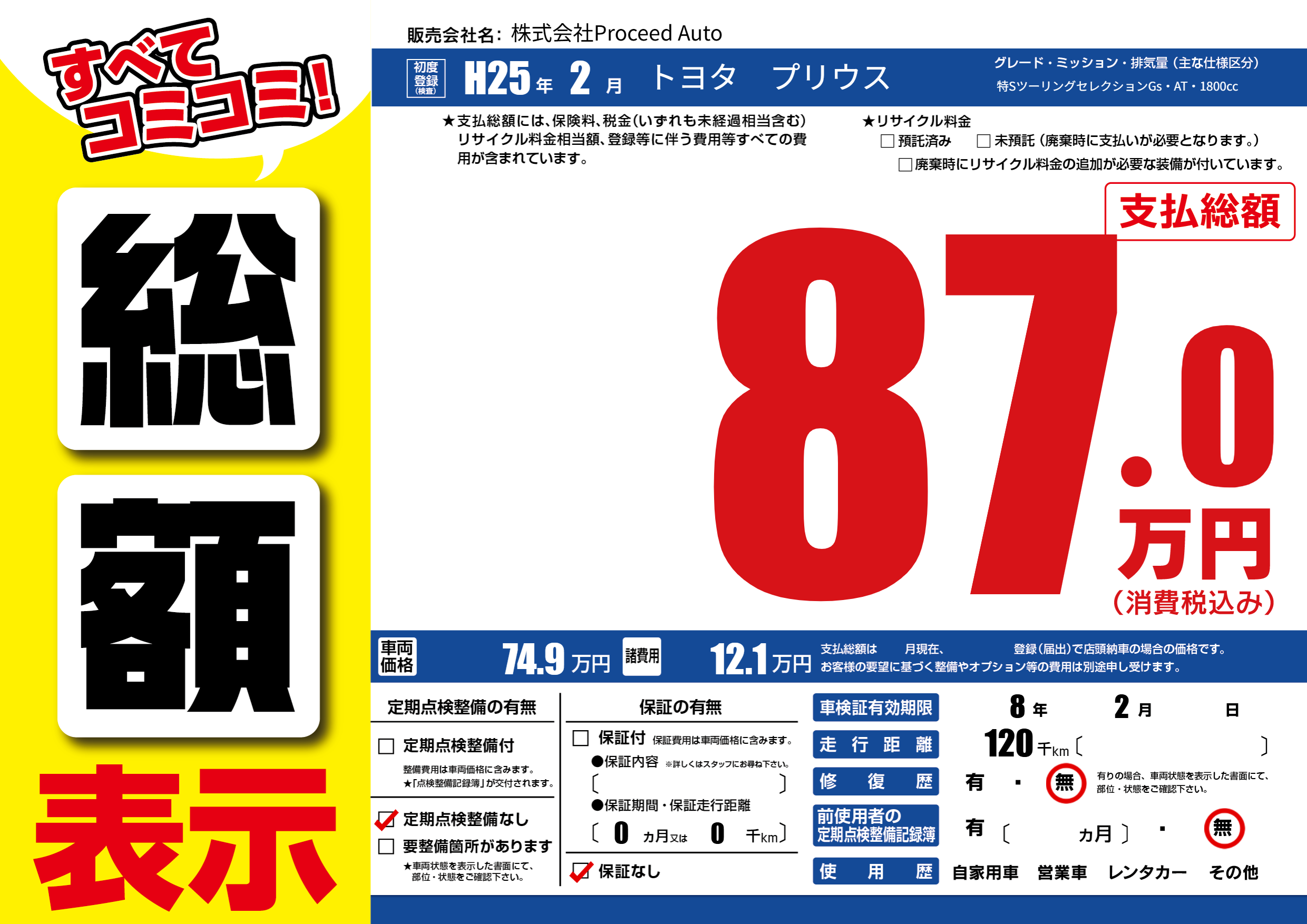 | 車名 | トヨタ プリウス | グレード ミッション 排気量 |