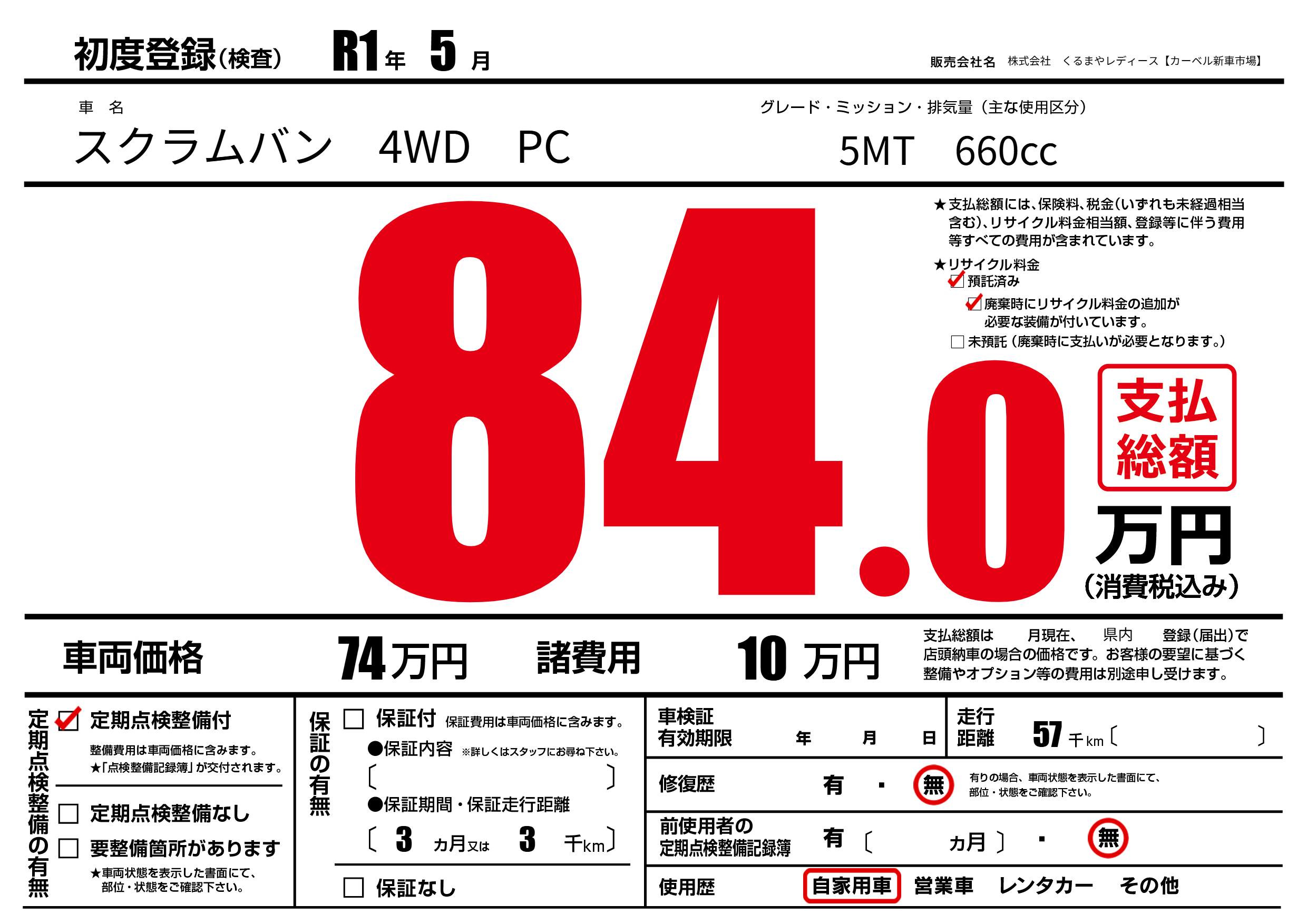 | 車名 | スクラムバン 4WD PC | グレード ミッション 排気量 |