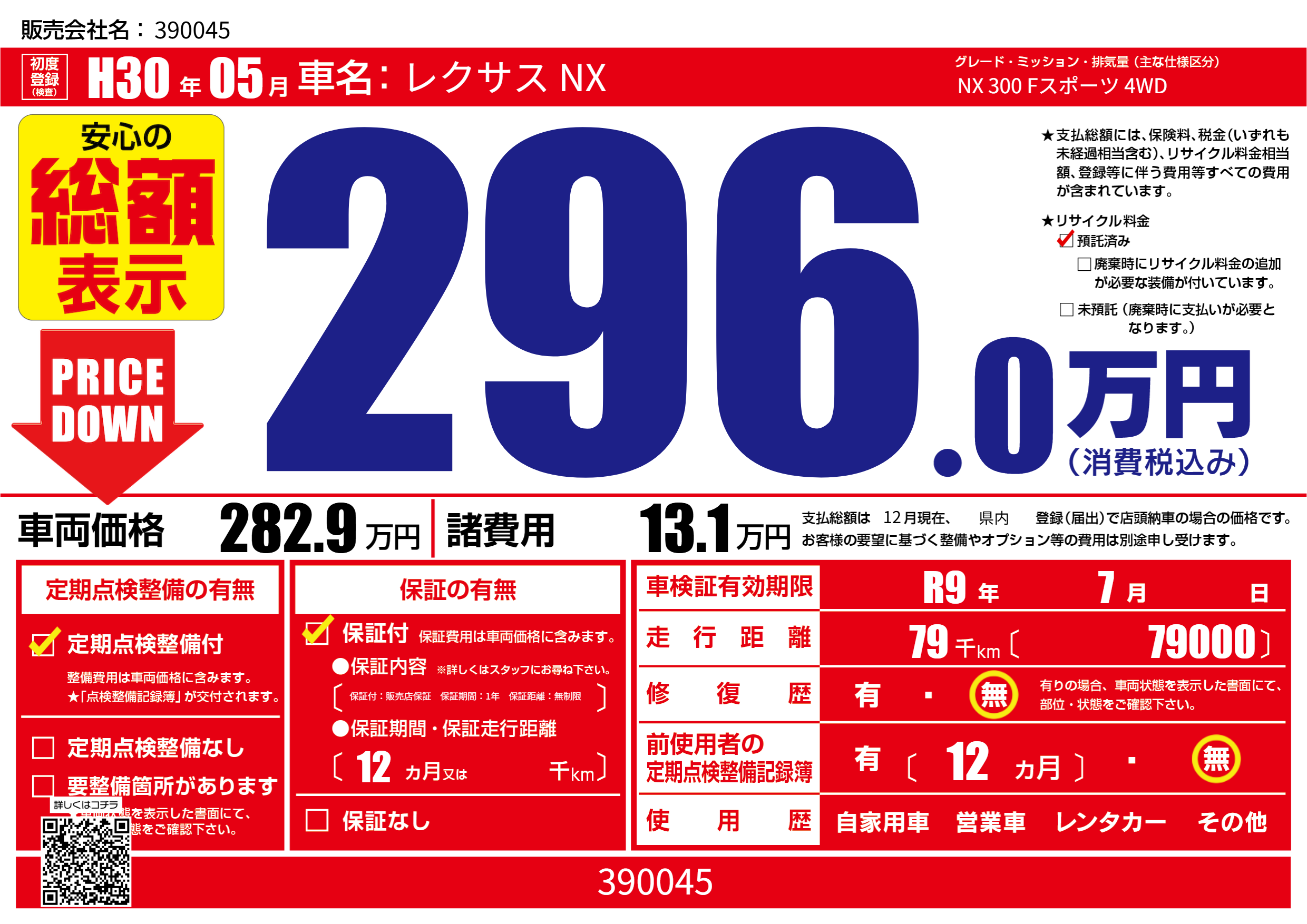 | 車名 | レクサス NX | グレード ミッション 排気量 |