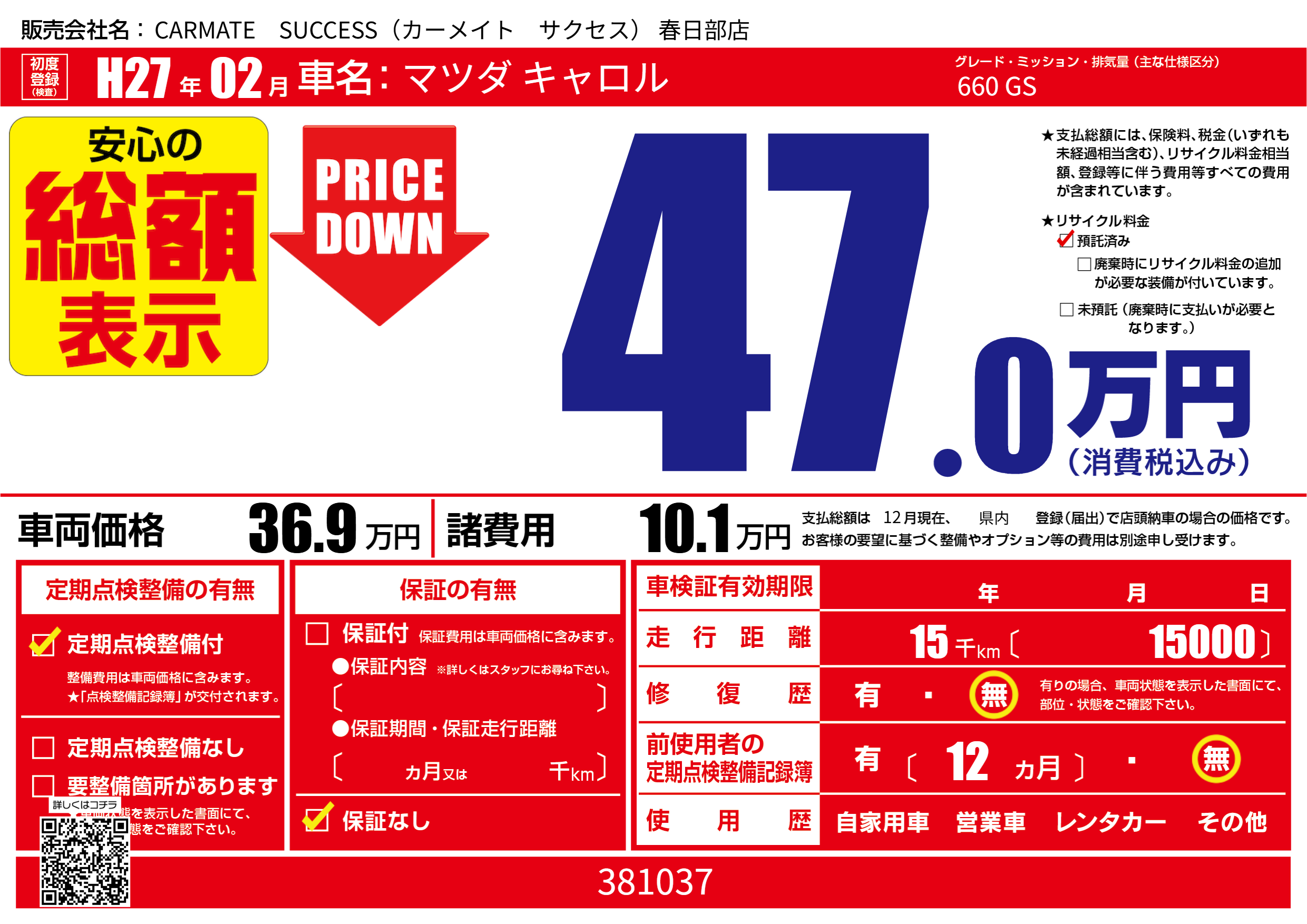| 車名 | マツダ キャロル | グレード ミッション 排気量 |