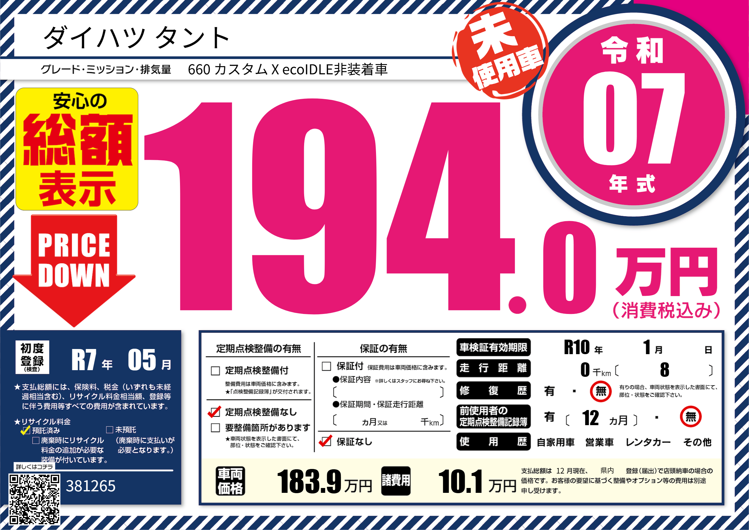 | 走行キロ | - | 初年度登録 | R7年05月 |