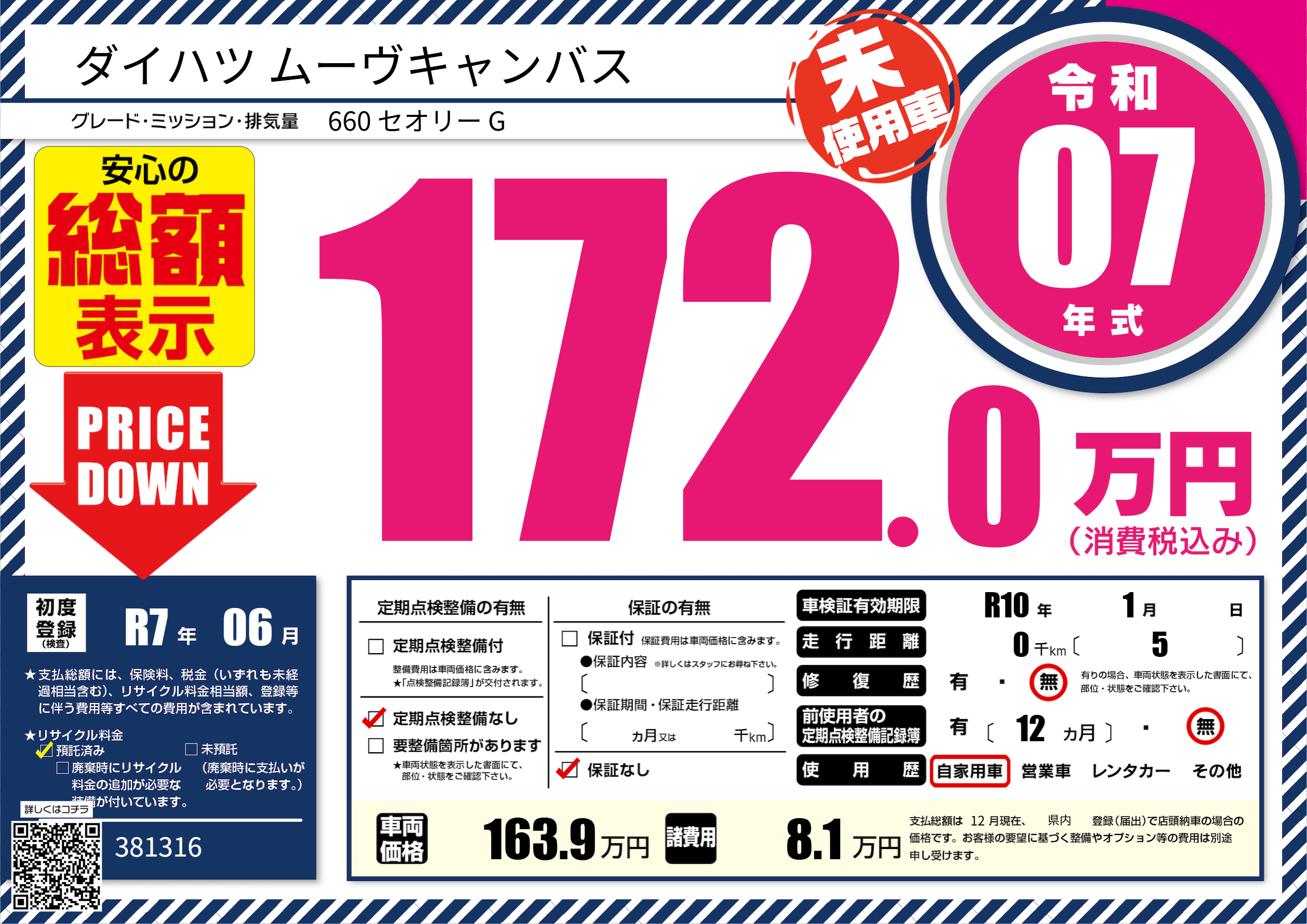| 走行キロ | - | 初年度登録 | R7年06月 |