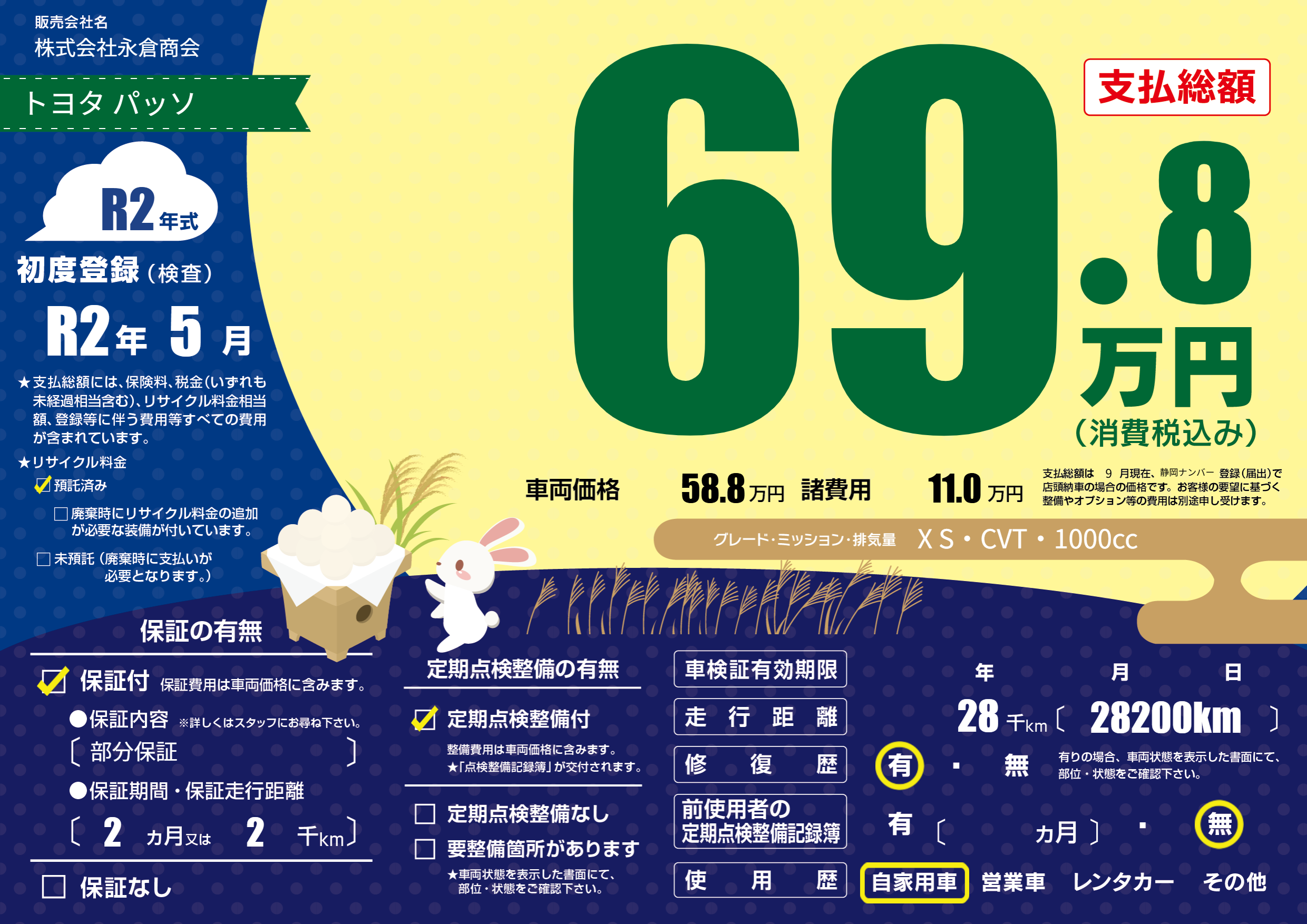 | 車名 | トヨタ パッソ | グレード ミッション 排気量 |