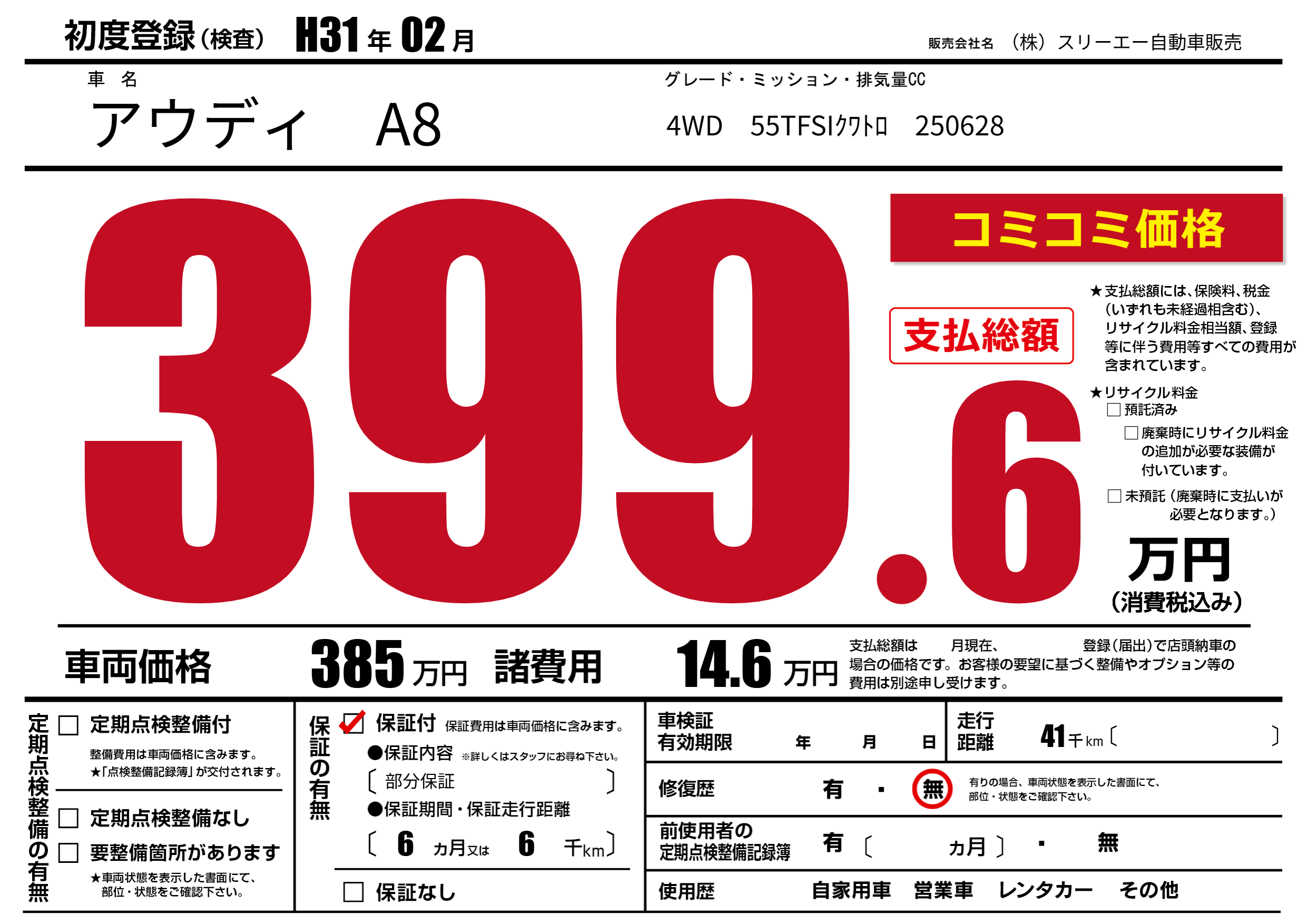 | 車名 | アウディ A8 | グレード ミッション 排気量 |