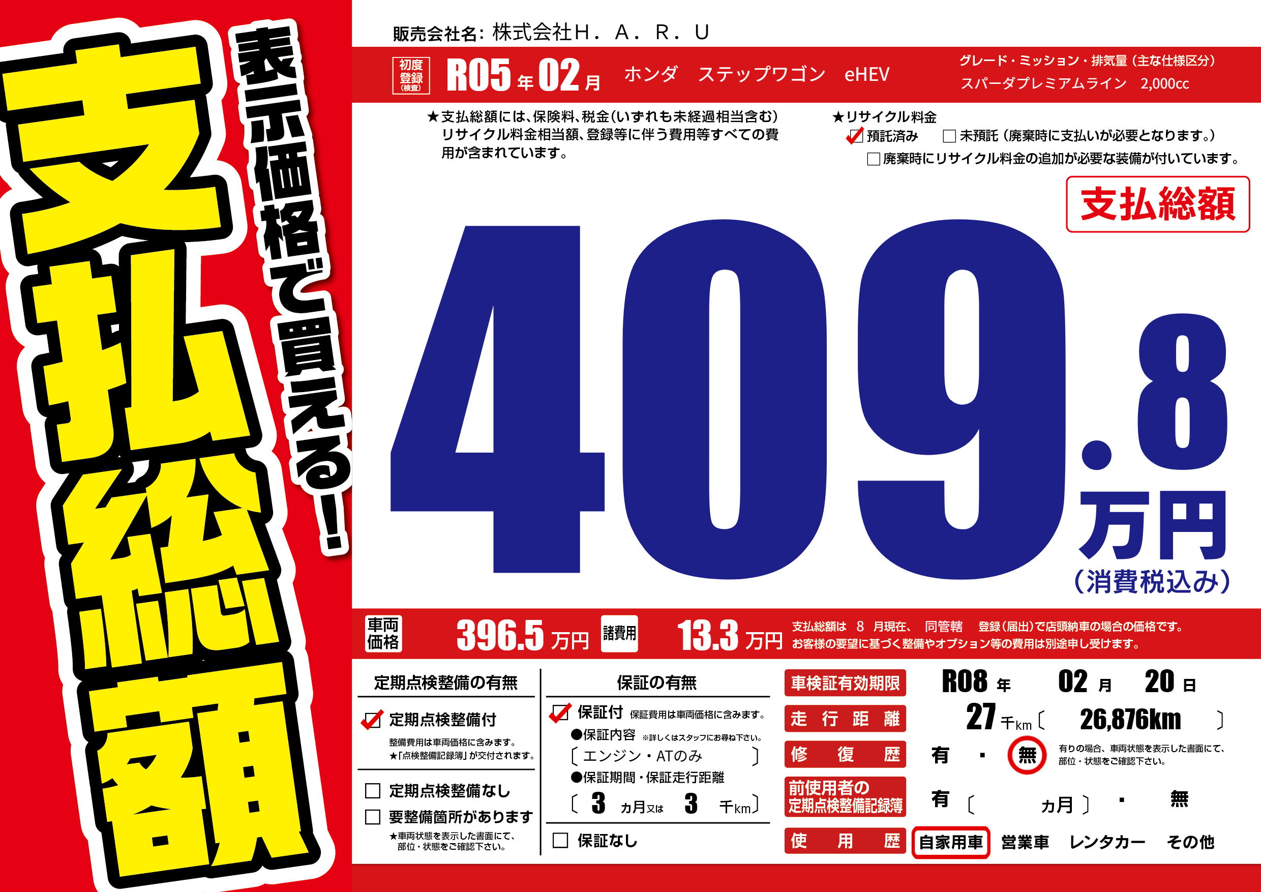 | 車名 | ホンダ ステップワゴン eHEV | グレード ミッション 排気量 |