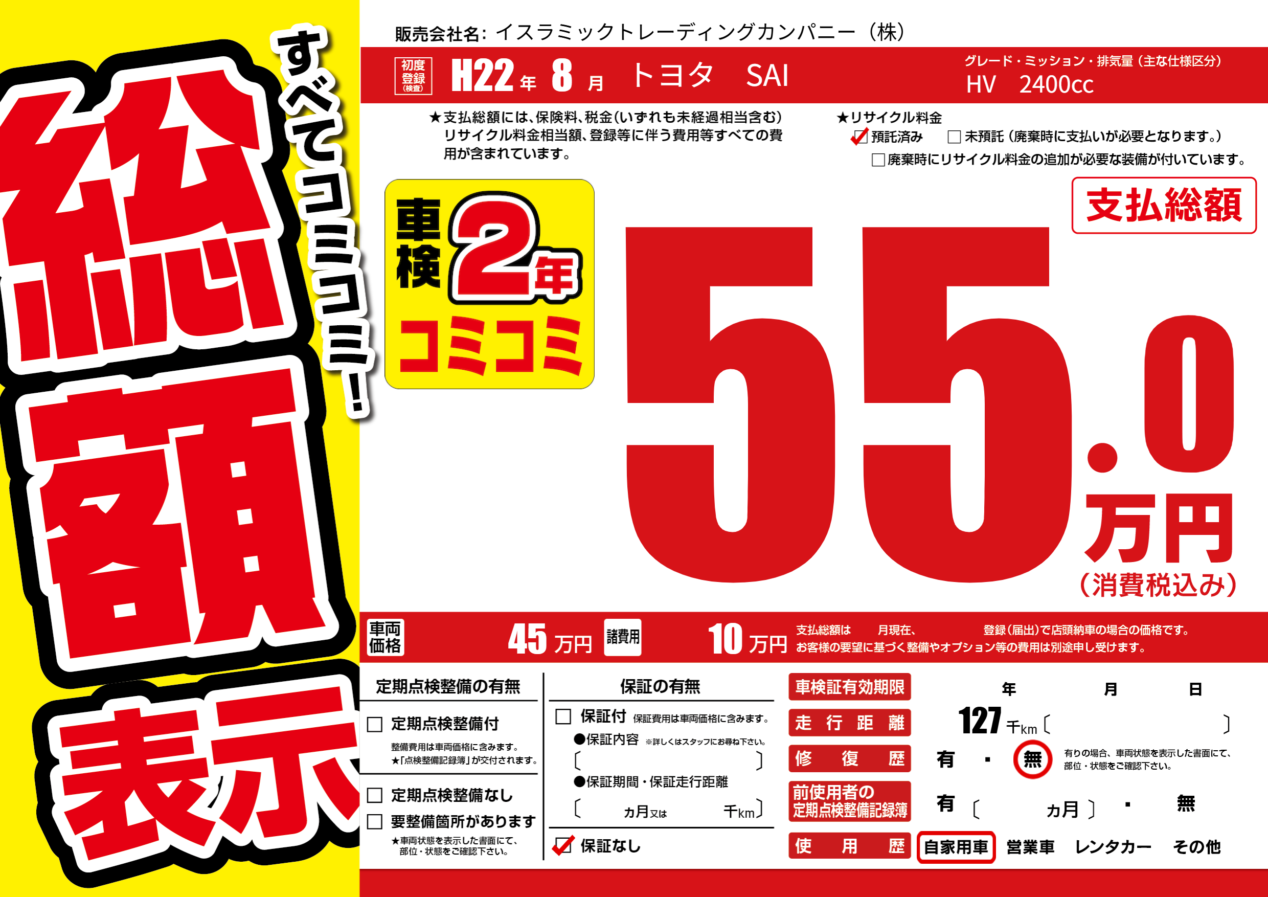 | 車名 | トヨタ SAI | グレード ミッション 排気量 |