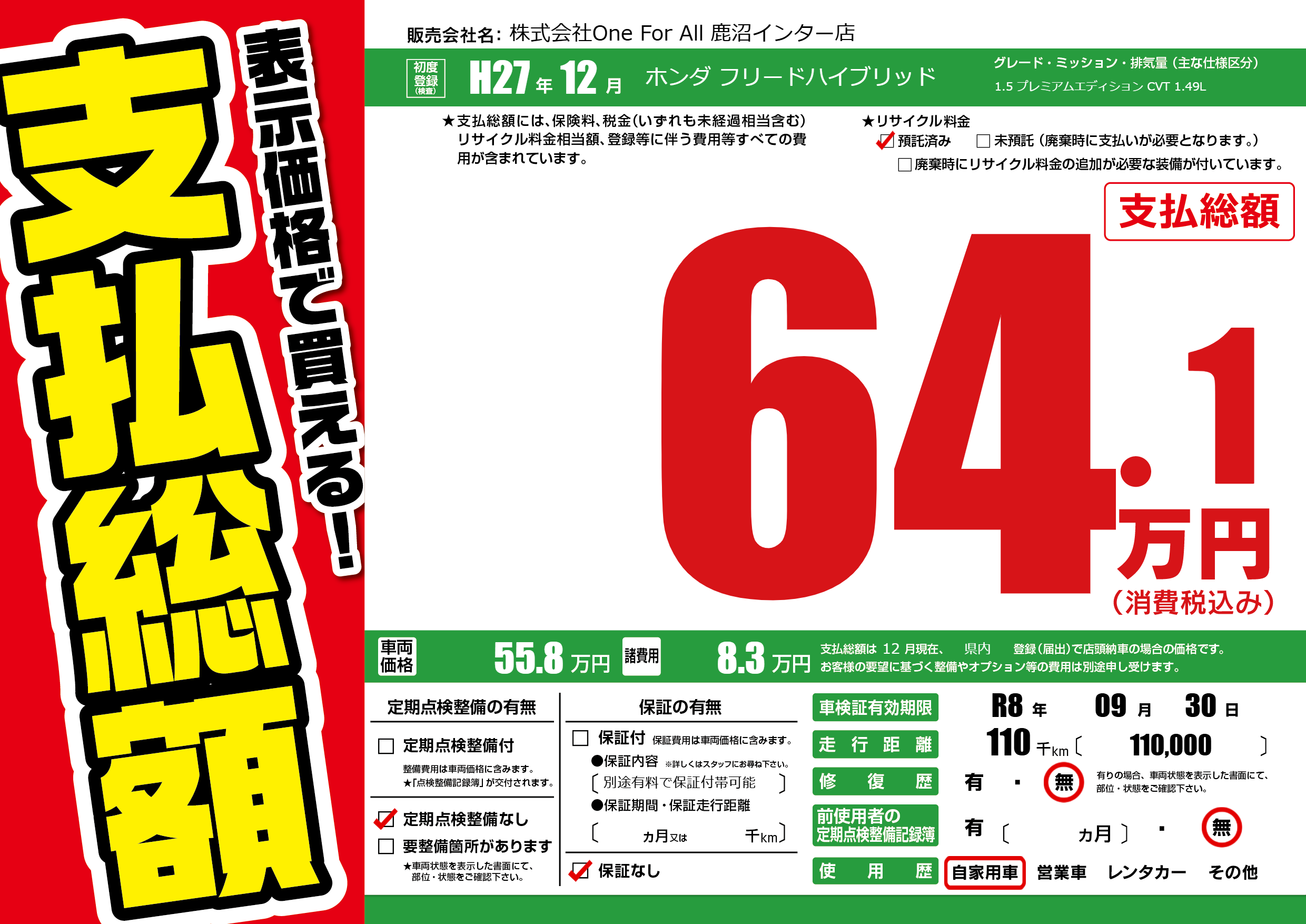 なし | 車検制限 | R8年09月30月 |