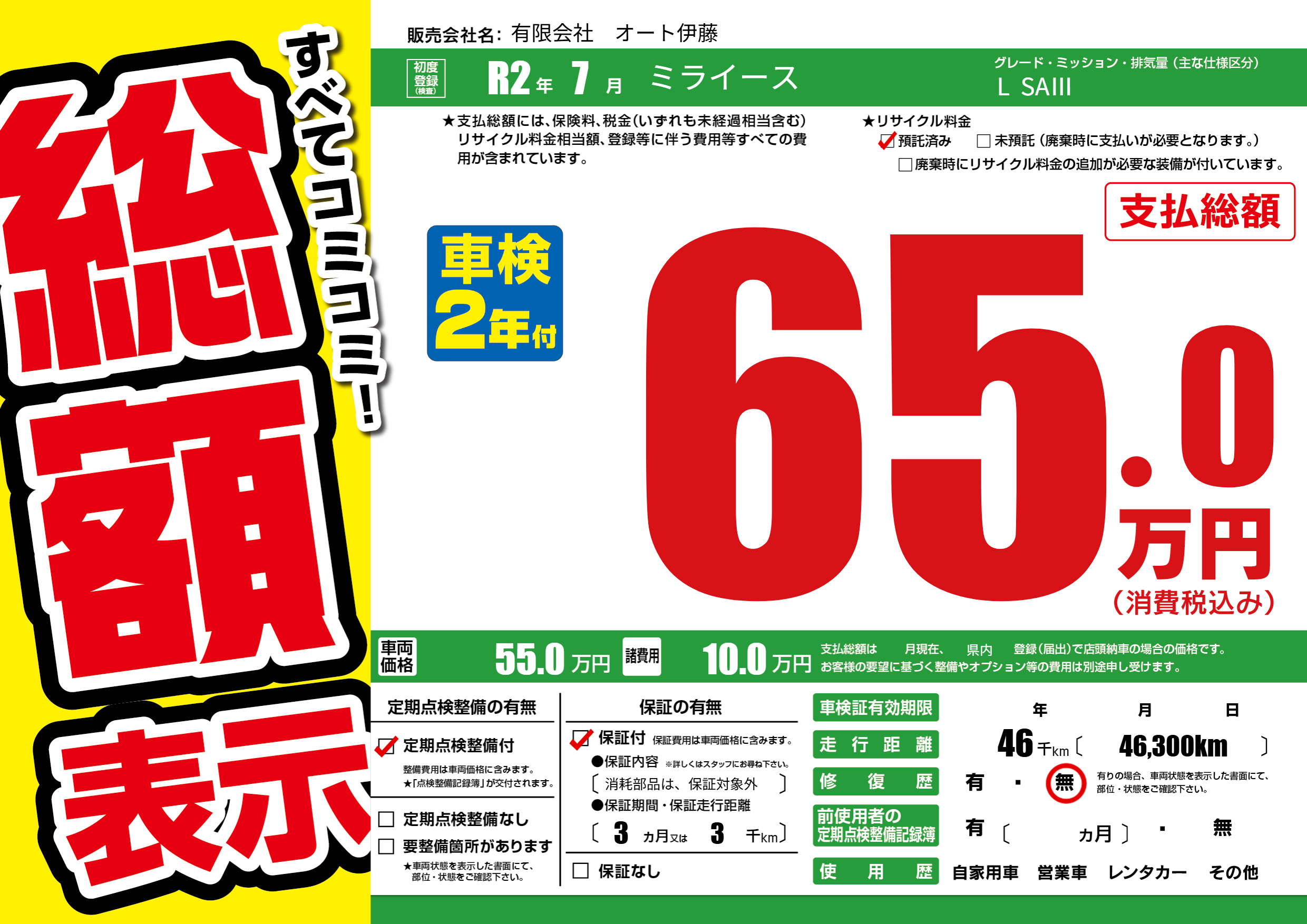 保証付き 保証内容(消耗部品は、保証対象外) 3ヶ月または3千km |