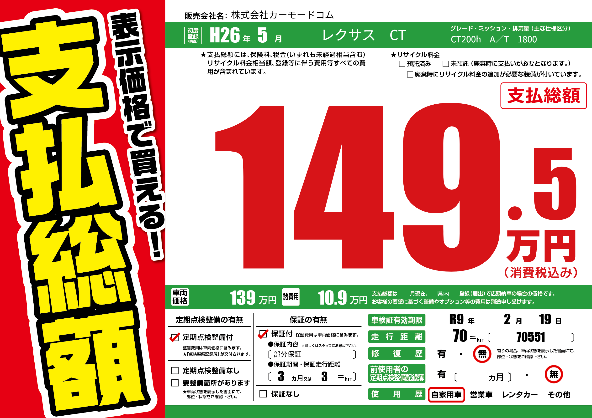| 車名 | レクサス CT | グレード ミッション 排気量 |