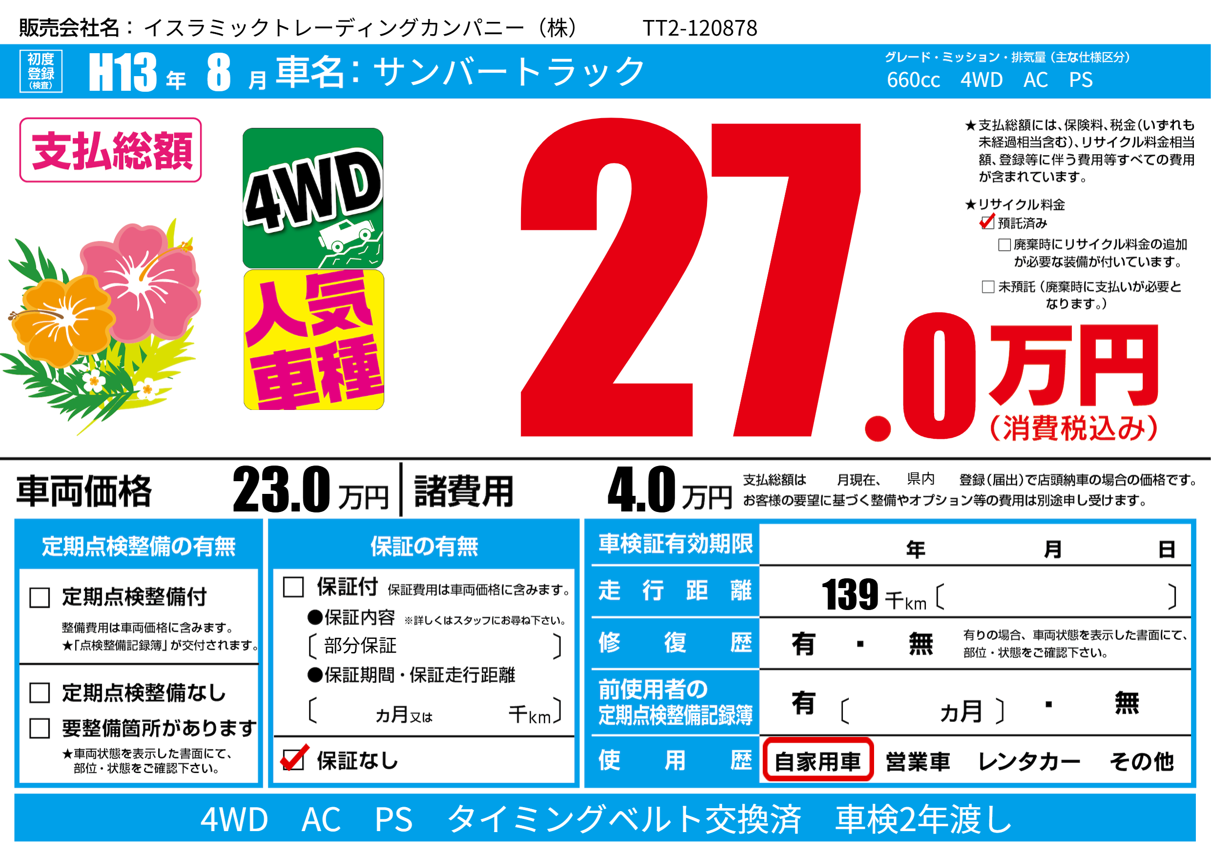 | 走行キロ | 13.9万km | 初年度登録 | H13年8月 |