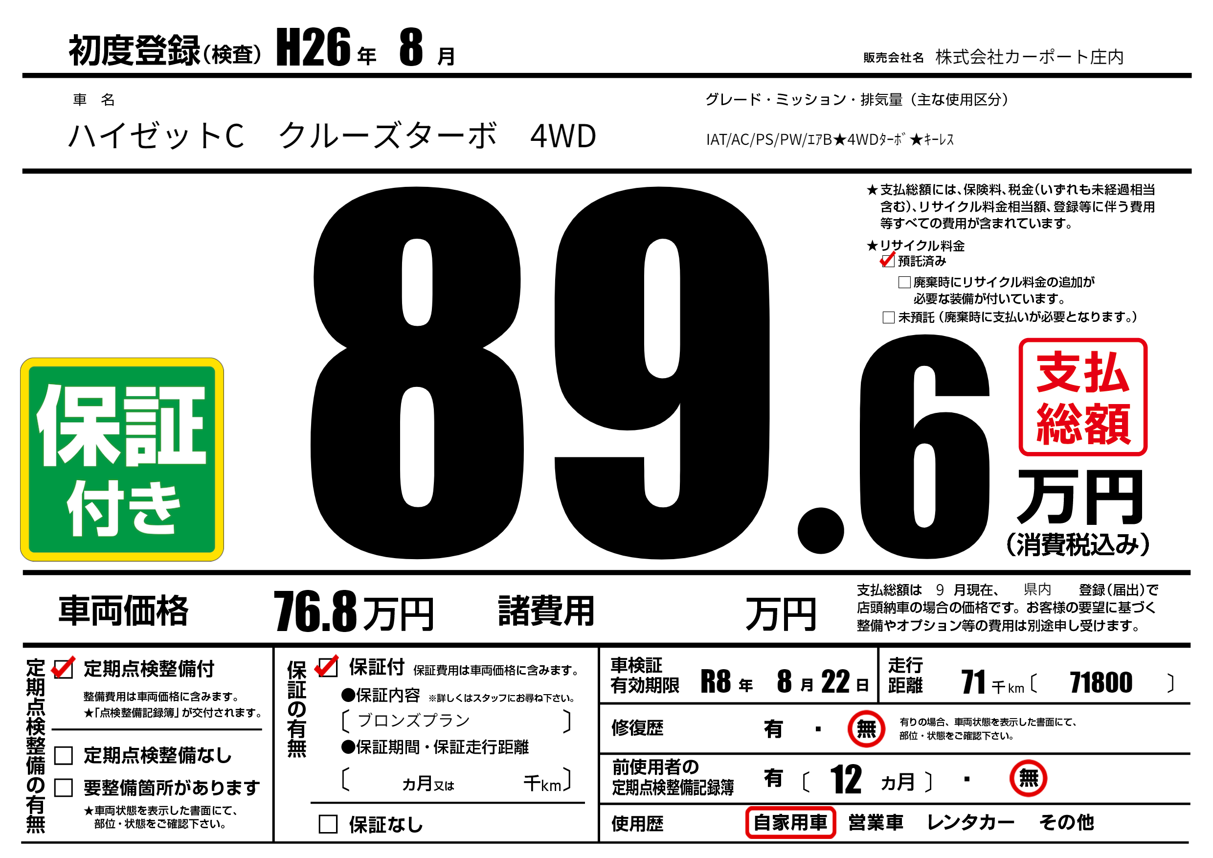| 車名 | ハイゼットC クルーズターボ 4WD | グレード ミッション 排気量 |