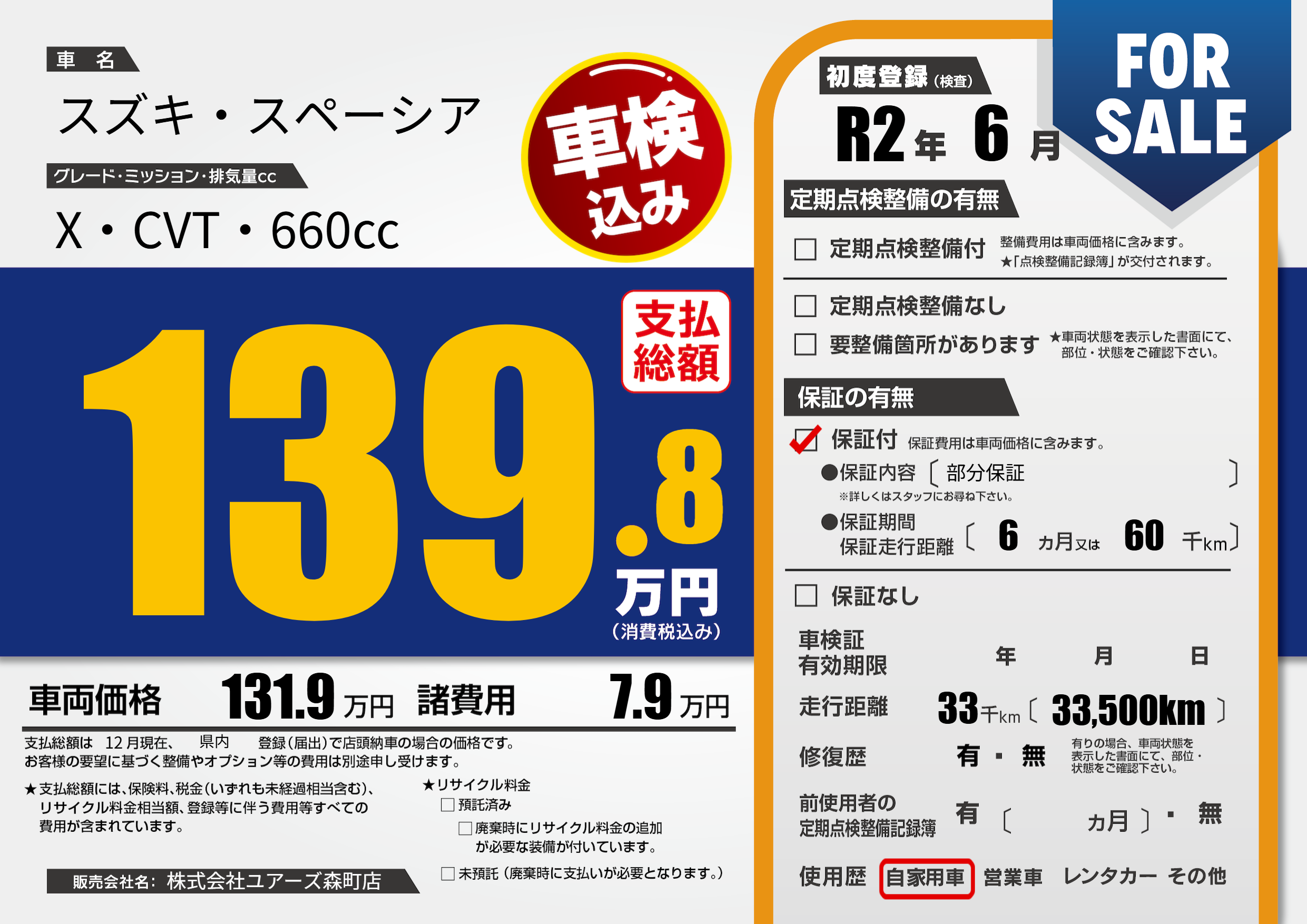 | 車名 | スズキ・スペーシア | グレード ミッション 排気量 |