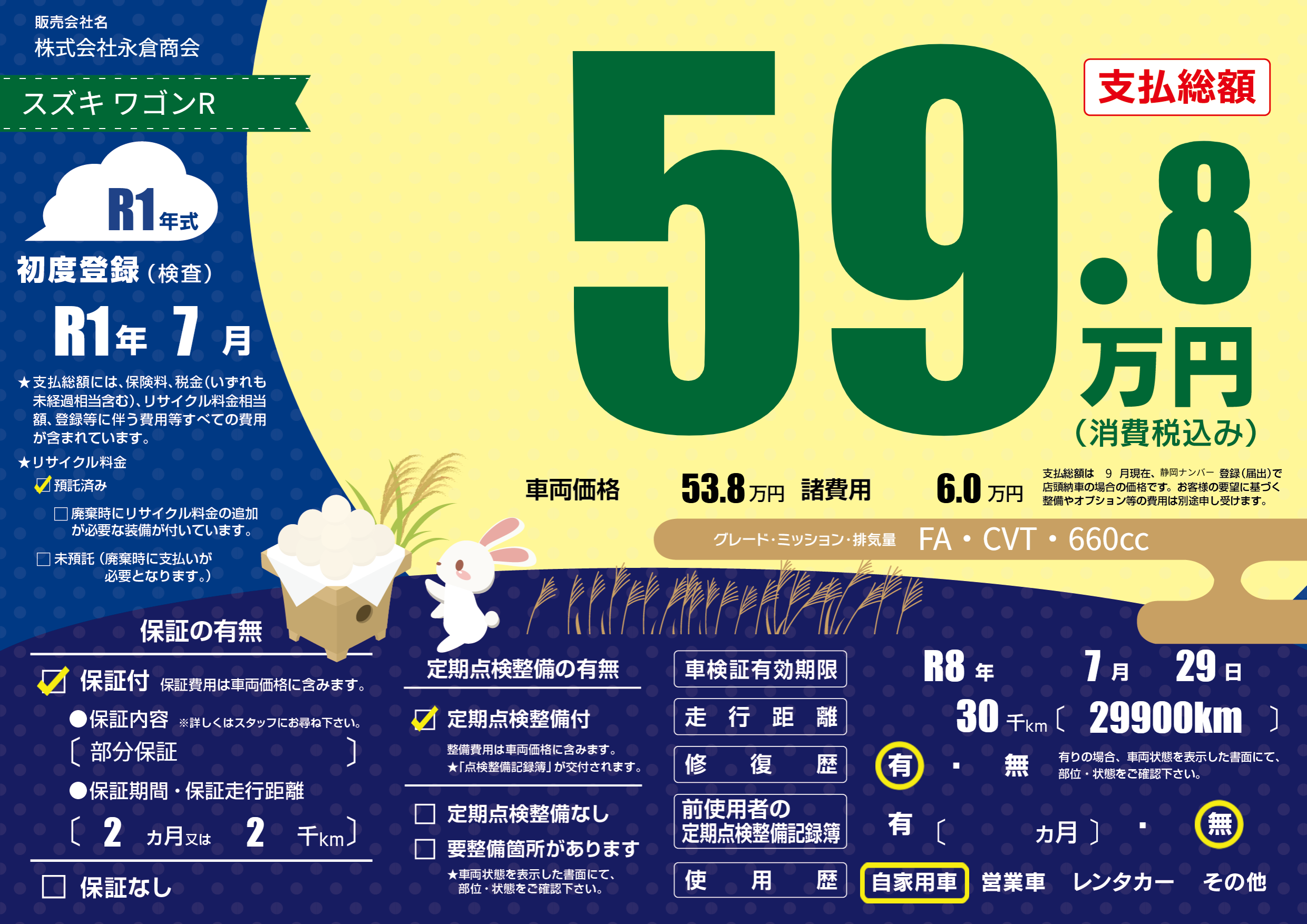 | 走行キロ | 3万km | 初年度登録 | R1年7月 |