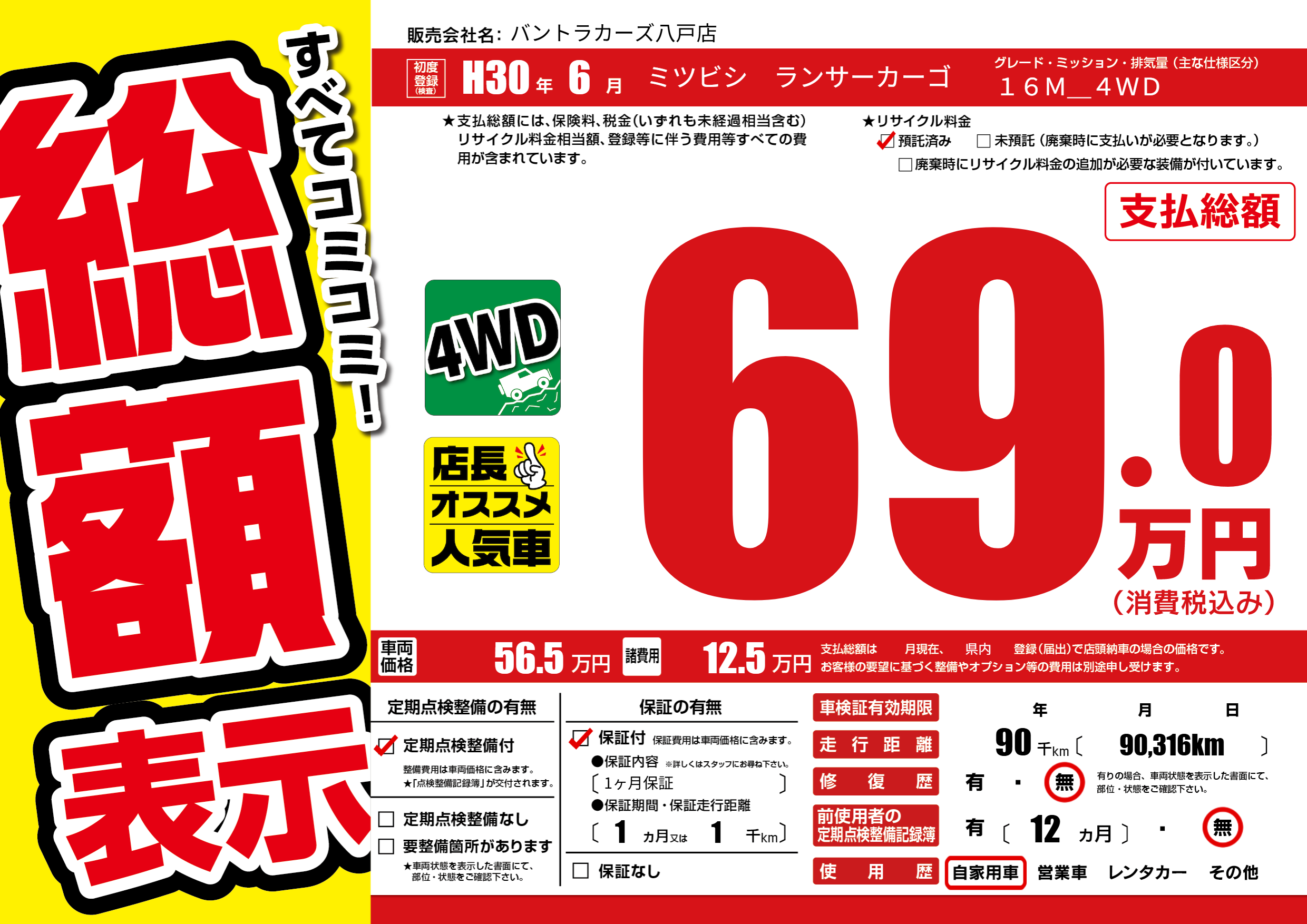 | 走行キロ | 9万km | 初年度登録 | H30年6月 |