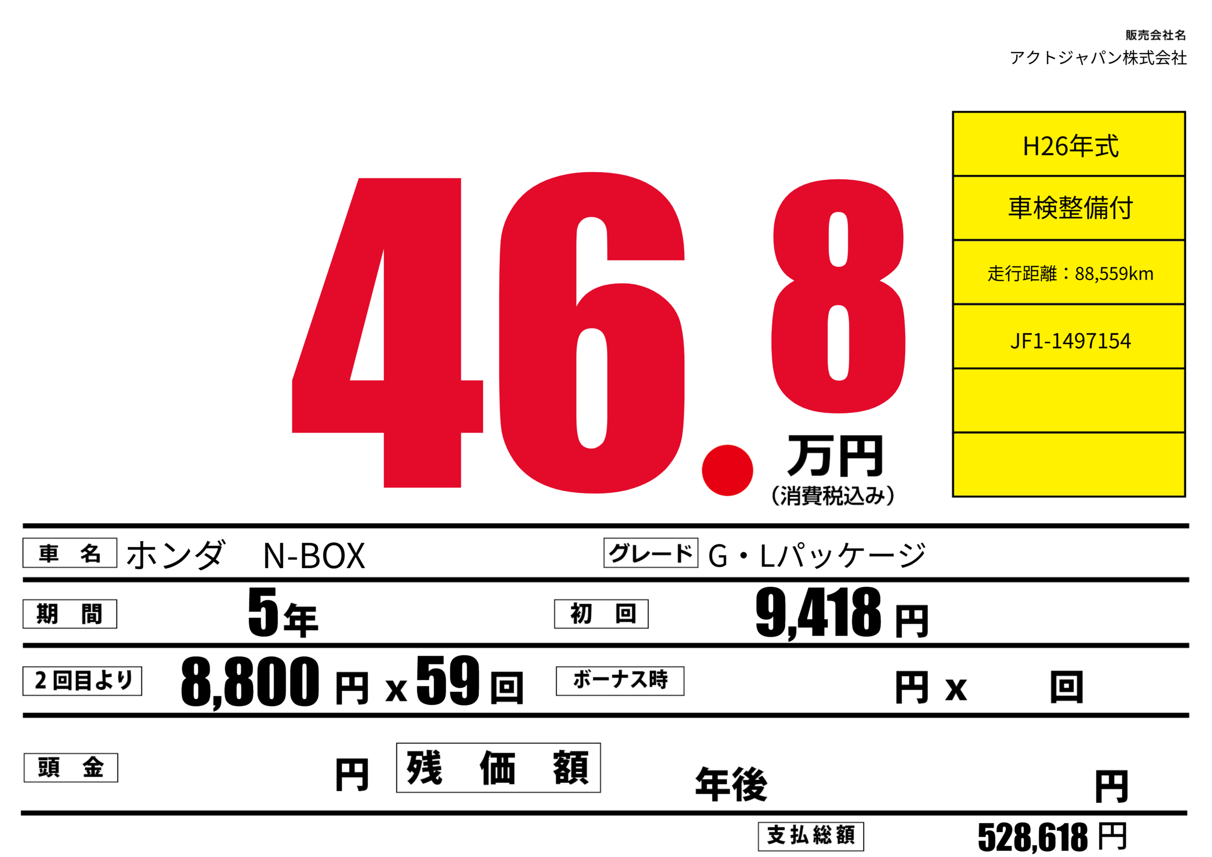 | 車名 | ホンダ N-BOX | グレード ミッション 排気量 |