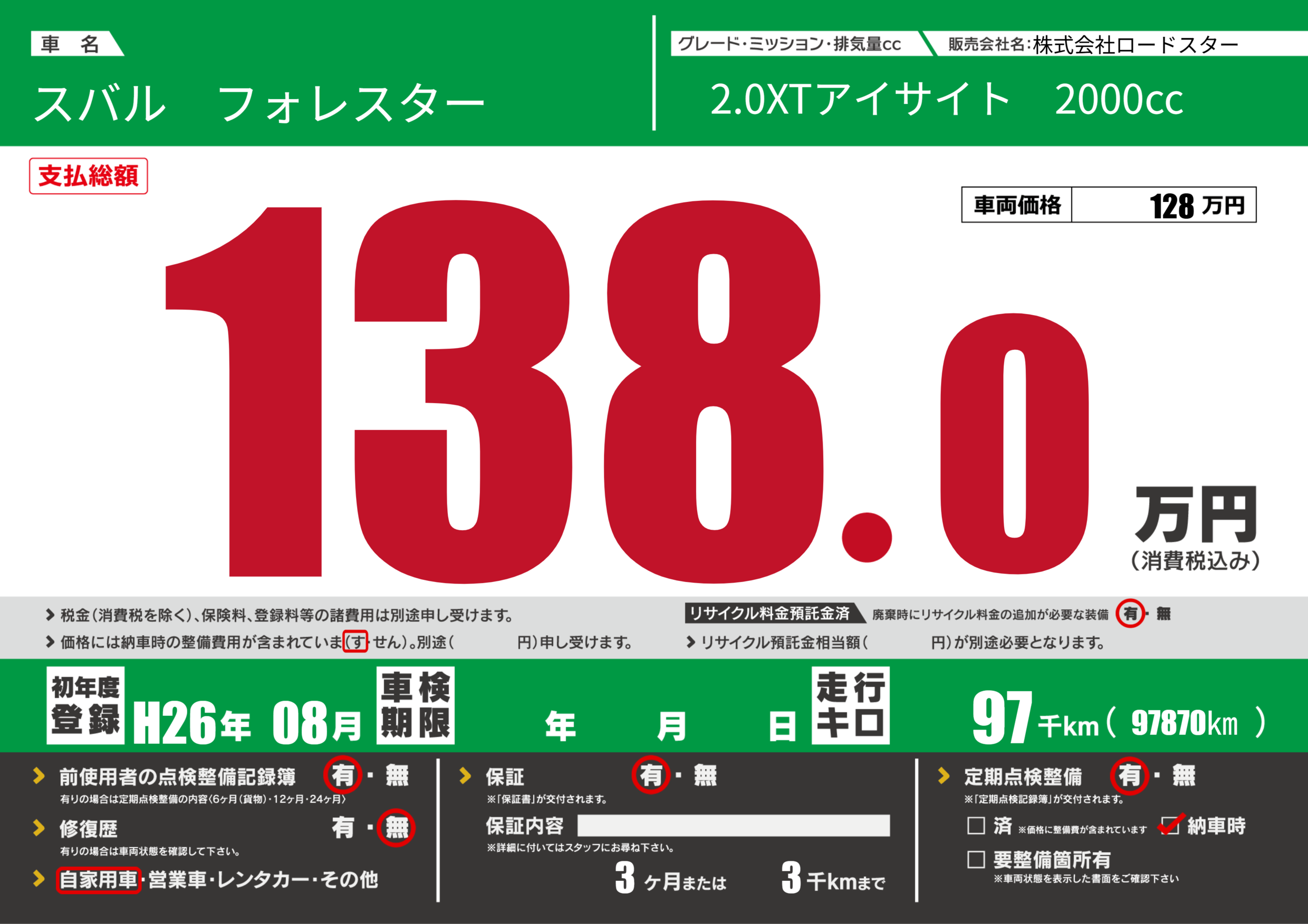 保証付き 保証内容(---) 3ヶ月または(3)千kmまで |