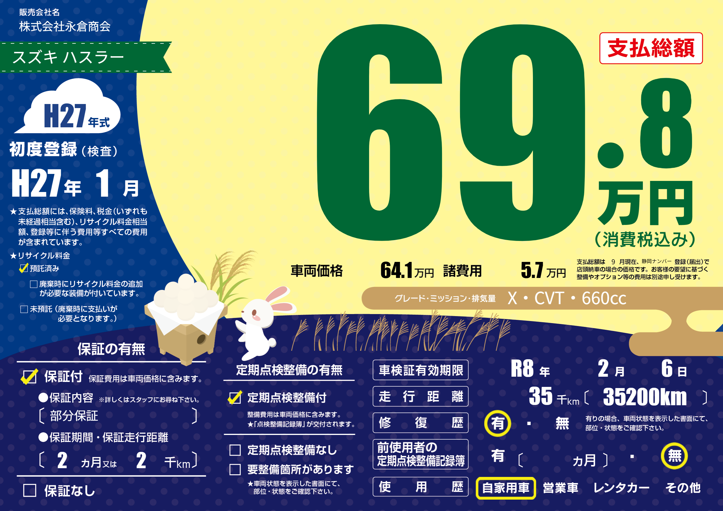 | 車名 | スズキ ハスラー | グレード ミッション 排気量 |