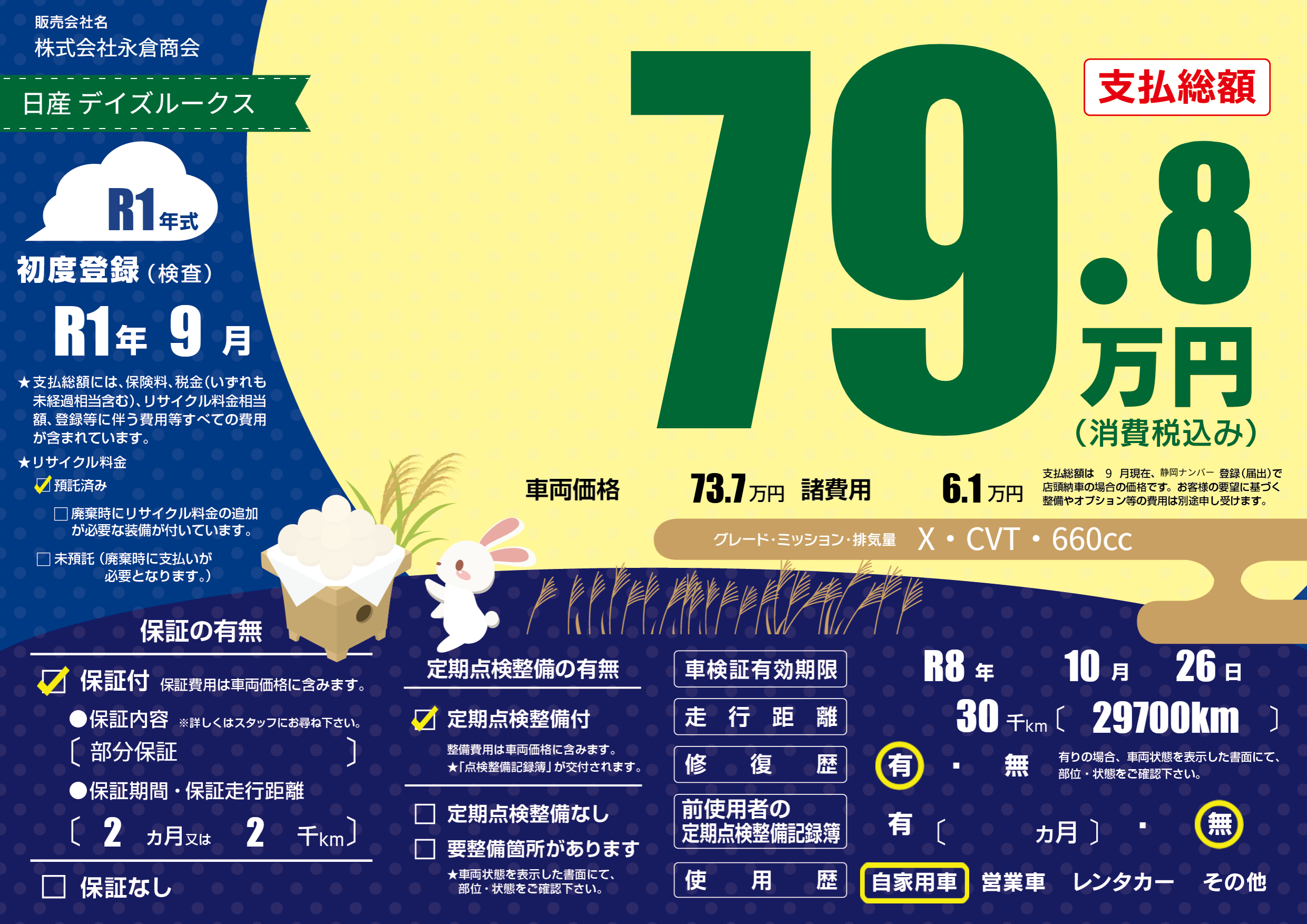 | 走行キロ | 3万km | 初年度登録 | R1年9月 |