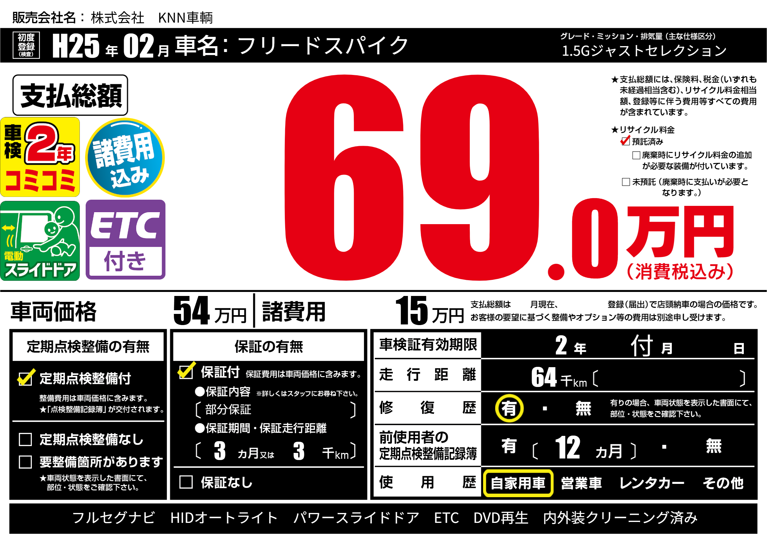 | 走行キロ | 6.4万km | 初年度登録 | H25年02月 |