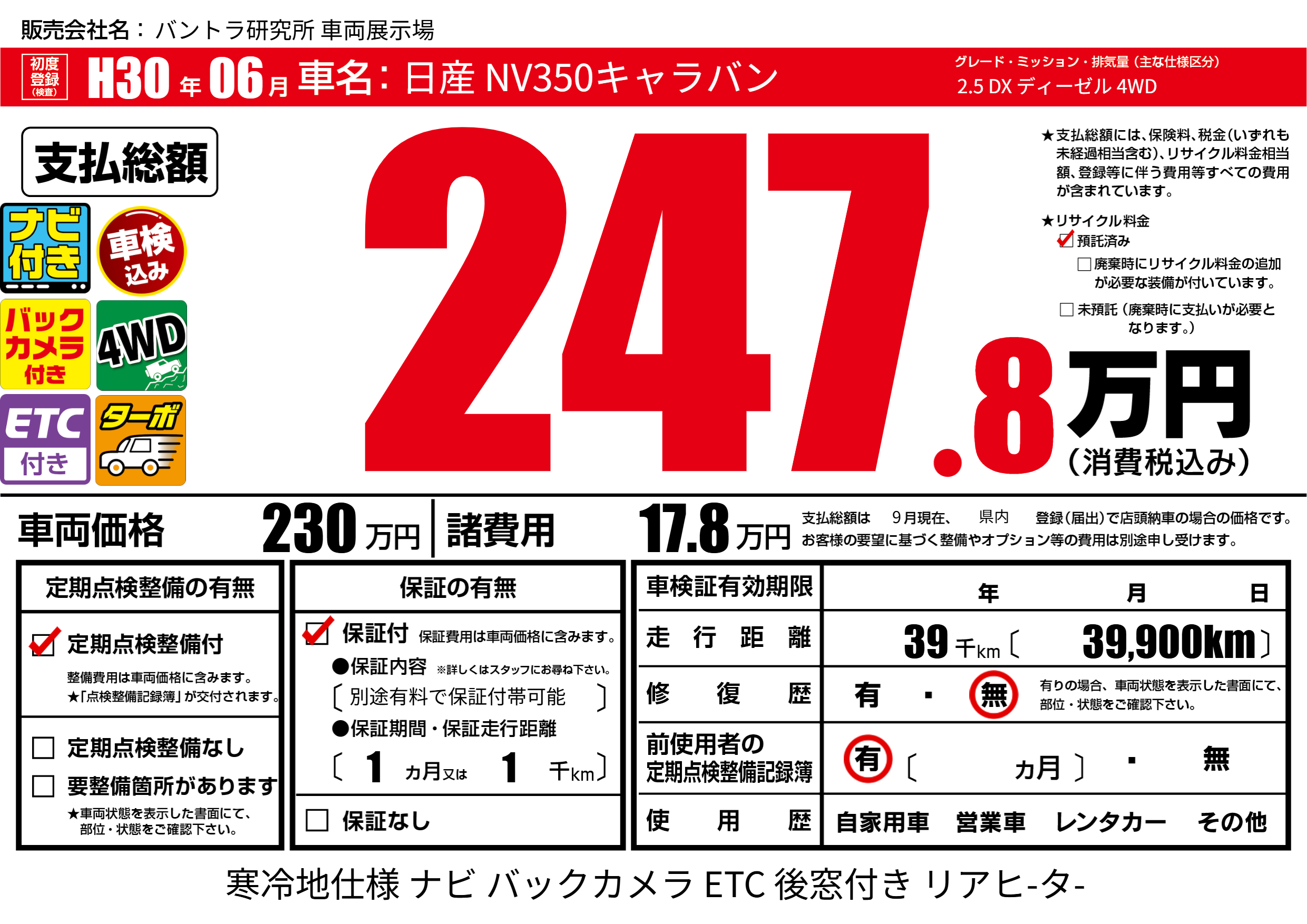 | 走行キロ | 3.9万km | 初年度登録 | H30年06月 |