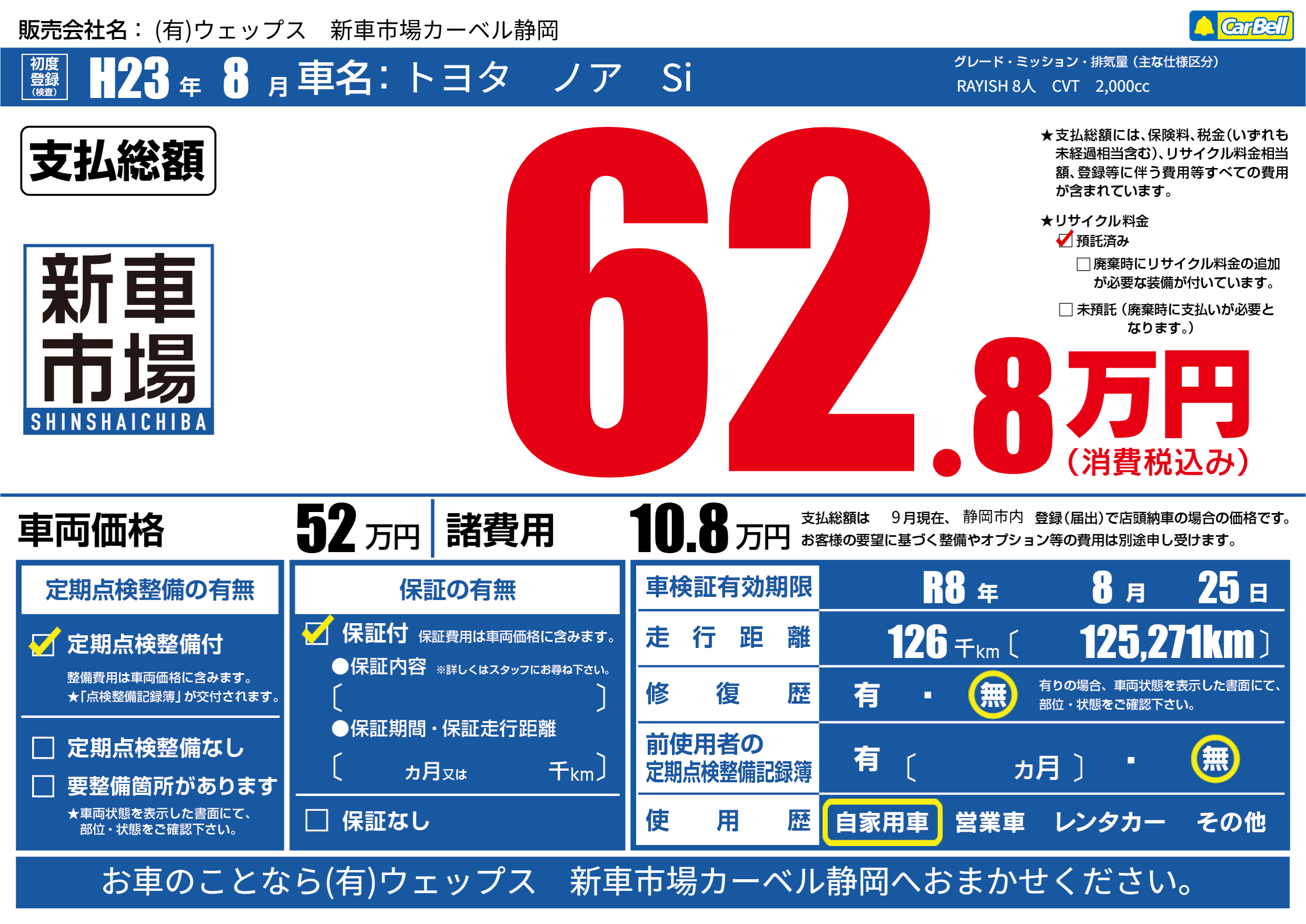 | 走行キロ | 12.6万km | 初年度登録 | H23年8月 |