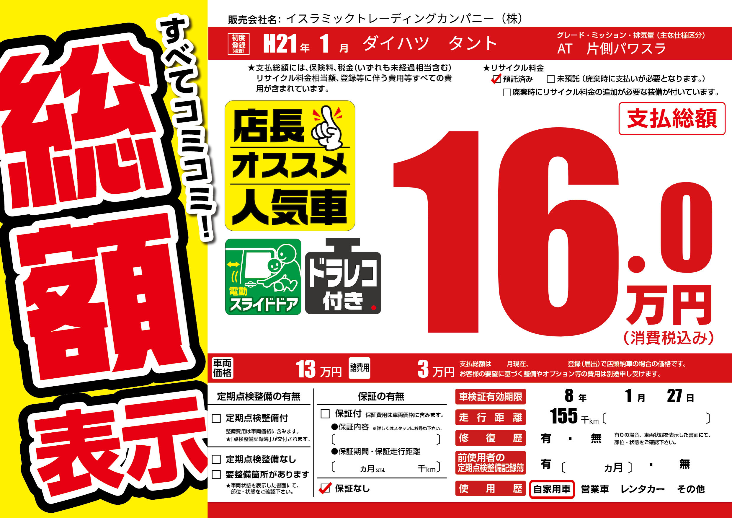 | 走行キロ | 15.5万km | 初年度登録 | H21年1月 |