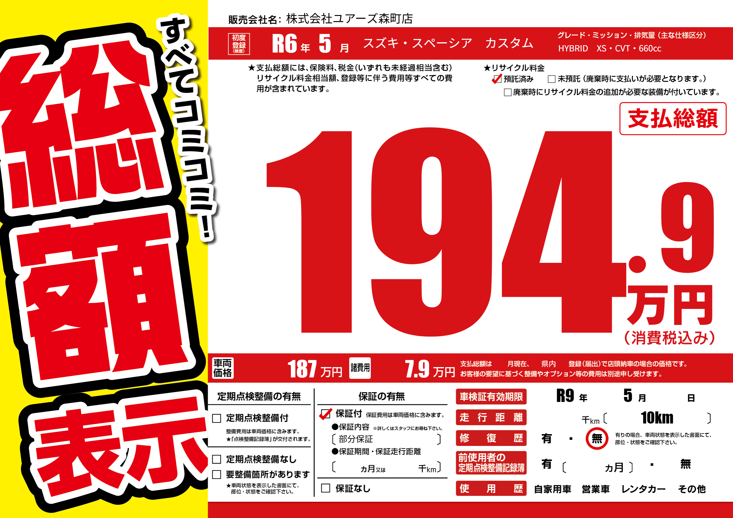 | 車名 | スズキ・スペーシア カスタム | グレード ミッション 排気量 |