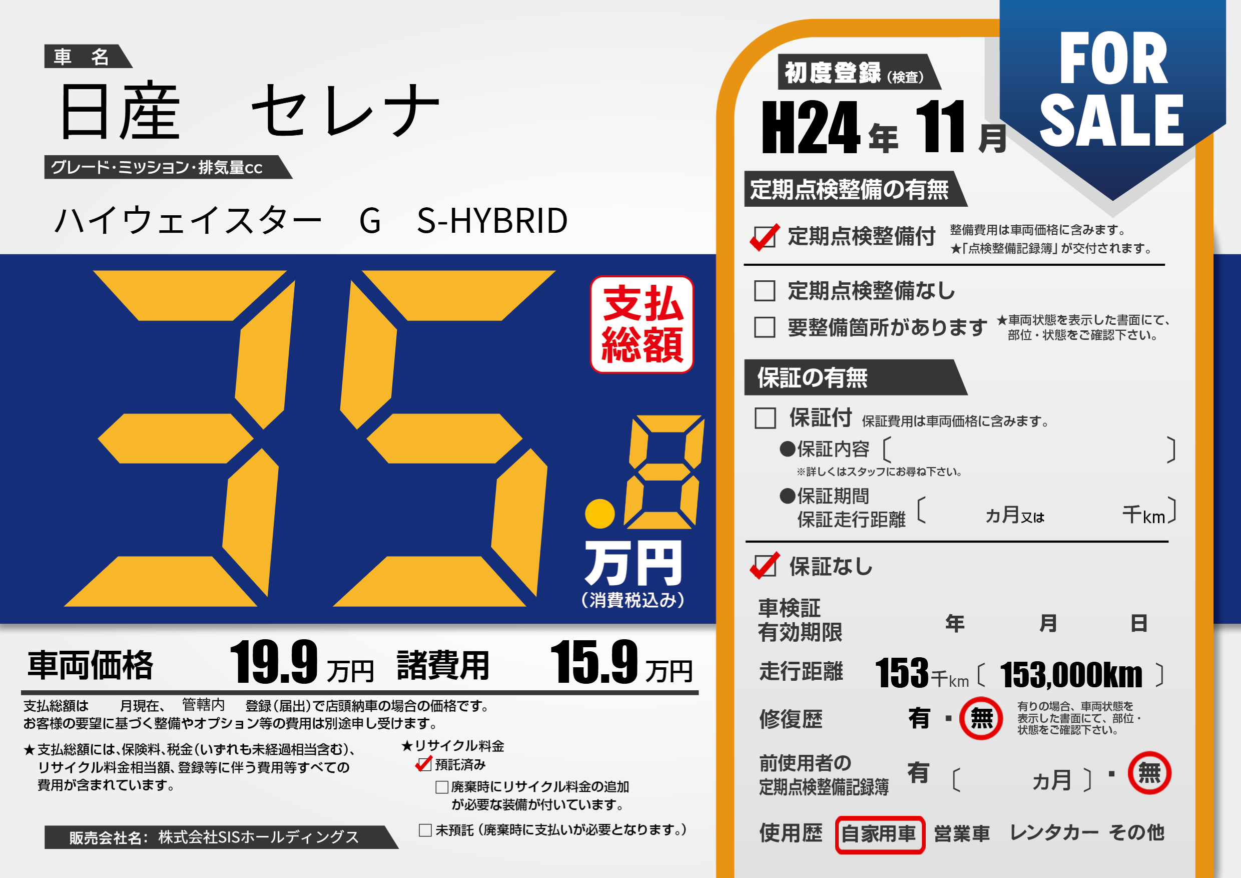 | 車名 | 日産 セレナ | グレード ミッション 排気量 |