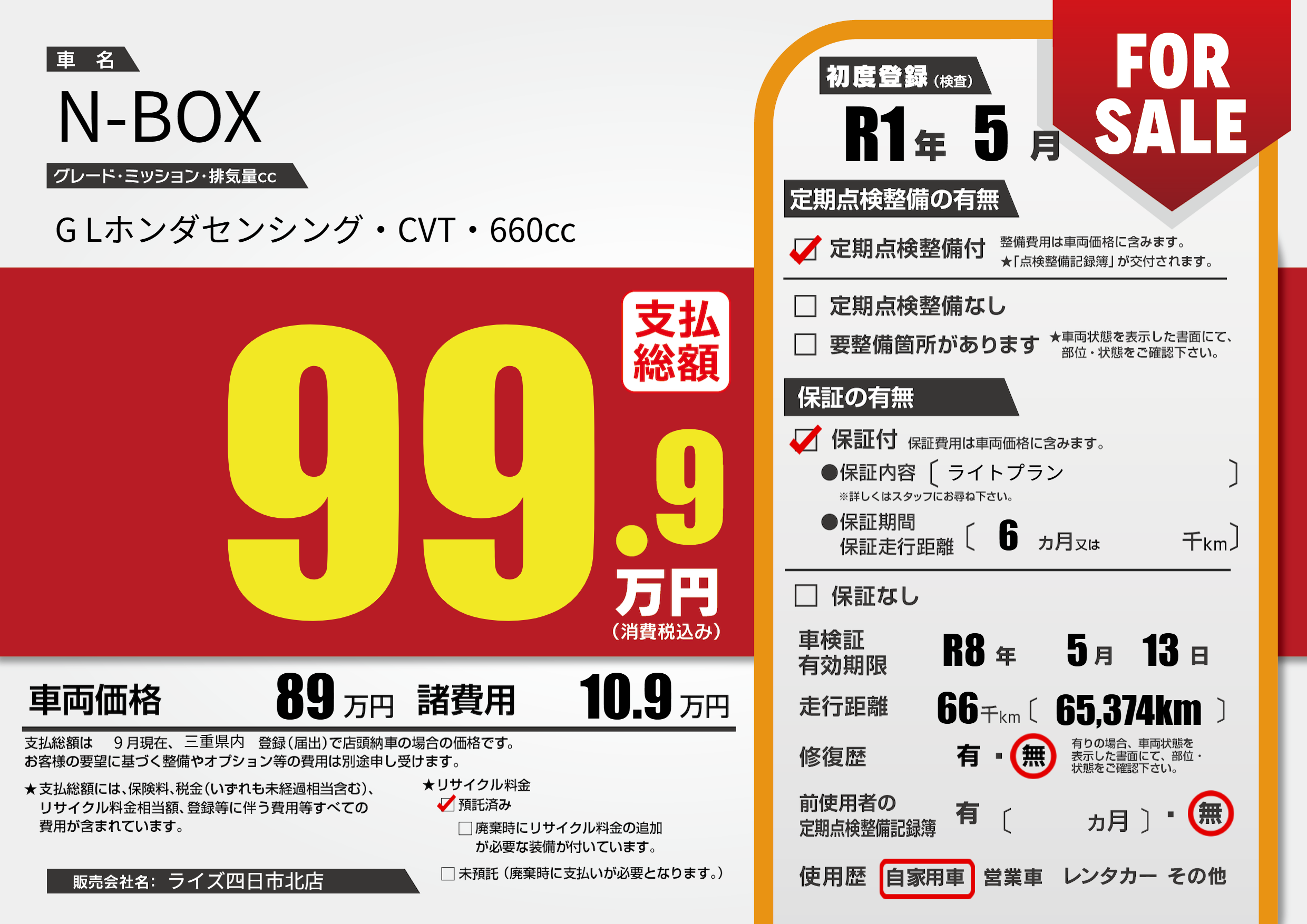 | 車名 | N-BOX | グレード ミッション 排気量 |