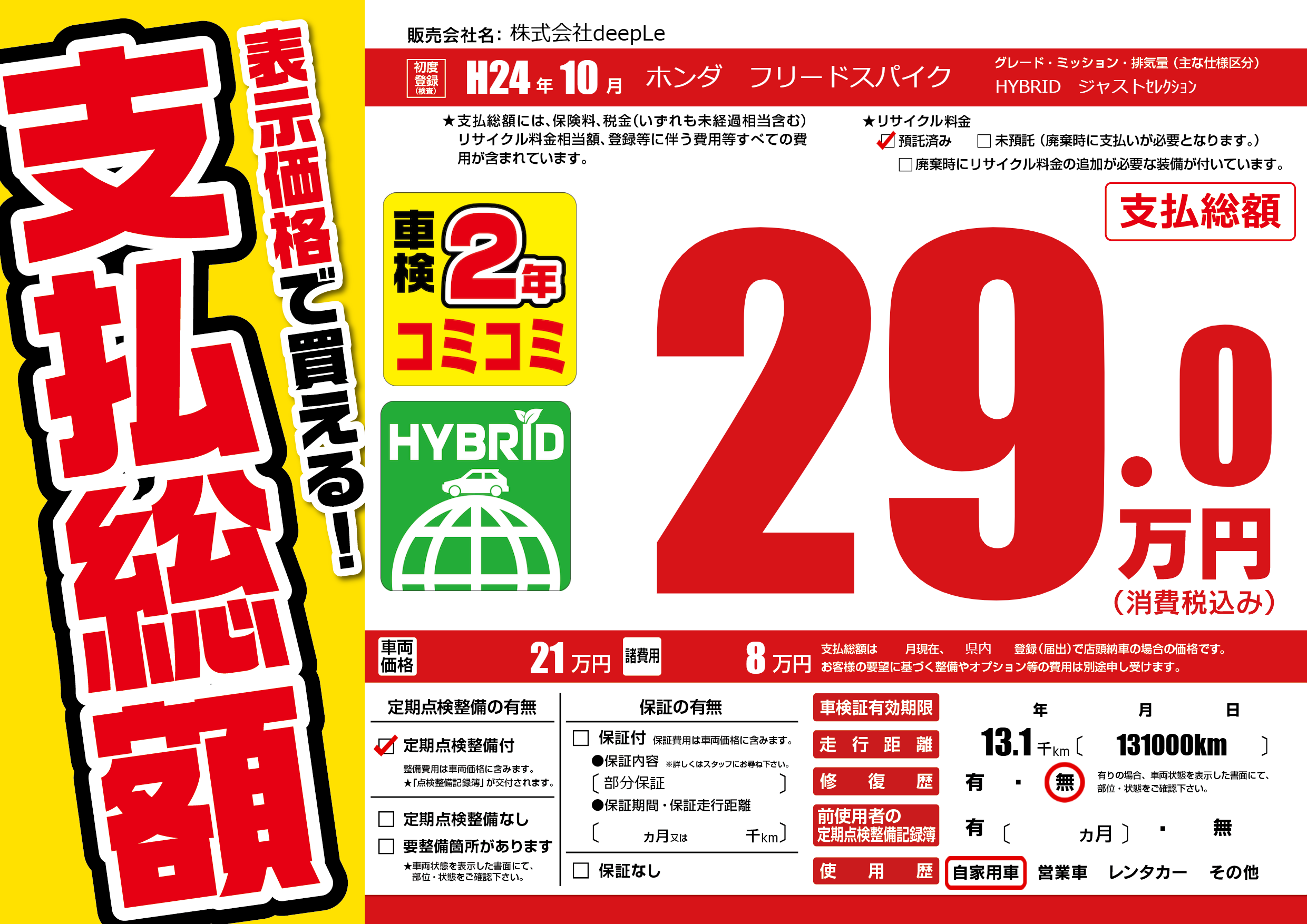 | 走行キロ | 1.3万km | 初年度登録 | H24年10月 |