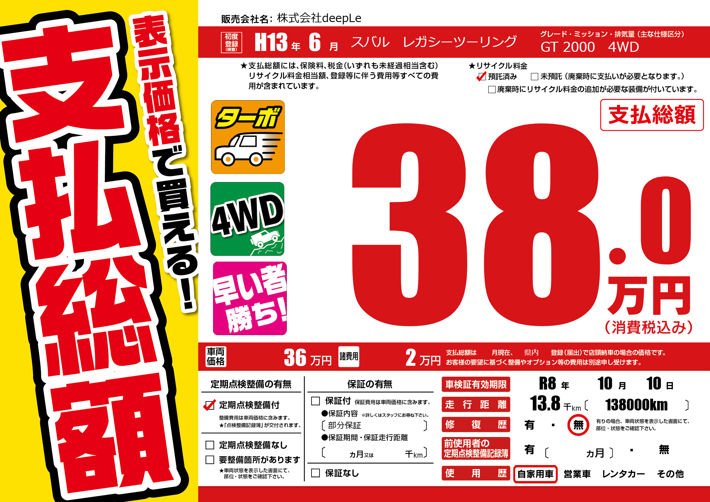 | 車名 | スバル レガシーツーリング | グレード ミッション 排気量 |