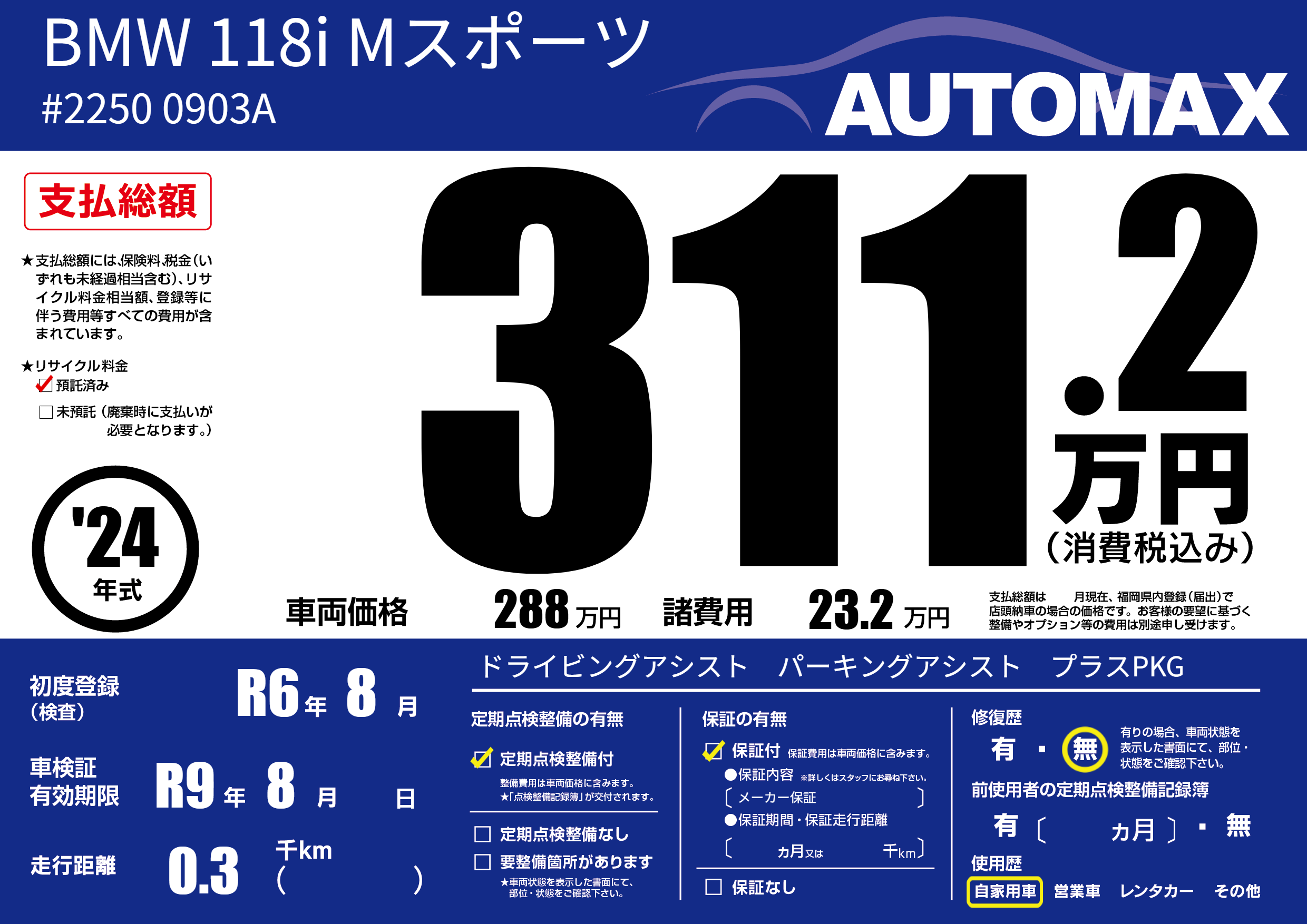 | 車検制限 | R9年 8月 - 日 | ||