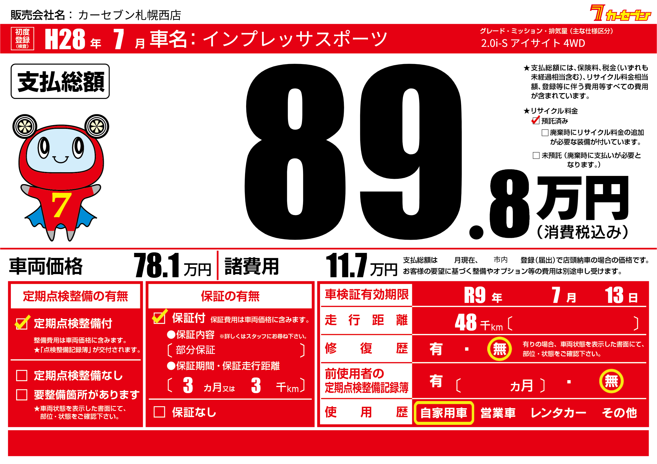 | 車名 | インプレッサスポーツ | グレード ミッション 排気量 |