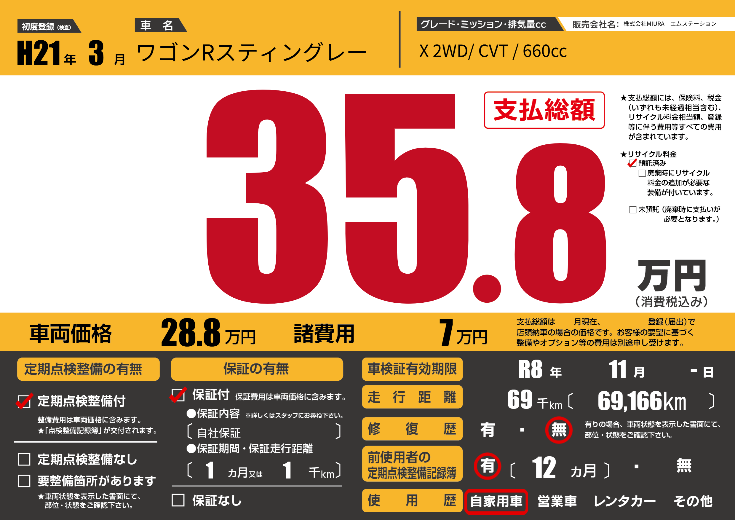 | 走行キロ | 6.9万km | 初年度登録 | H21年3月 |