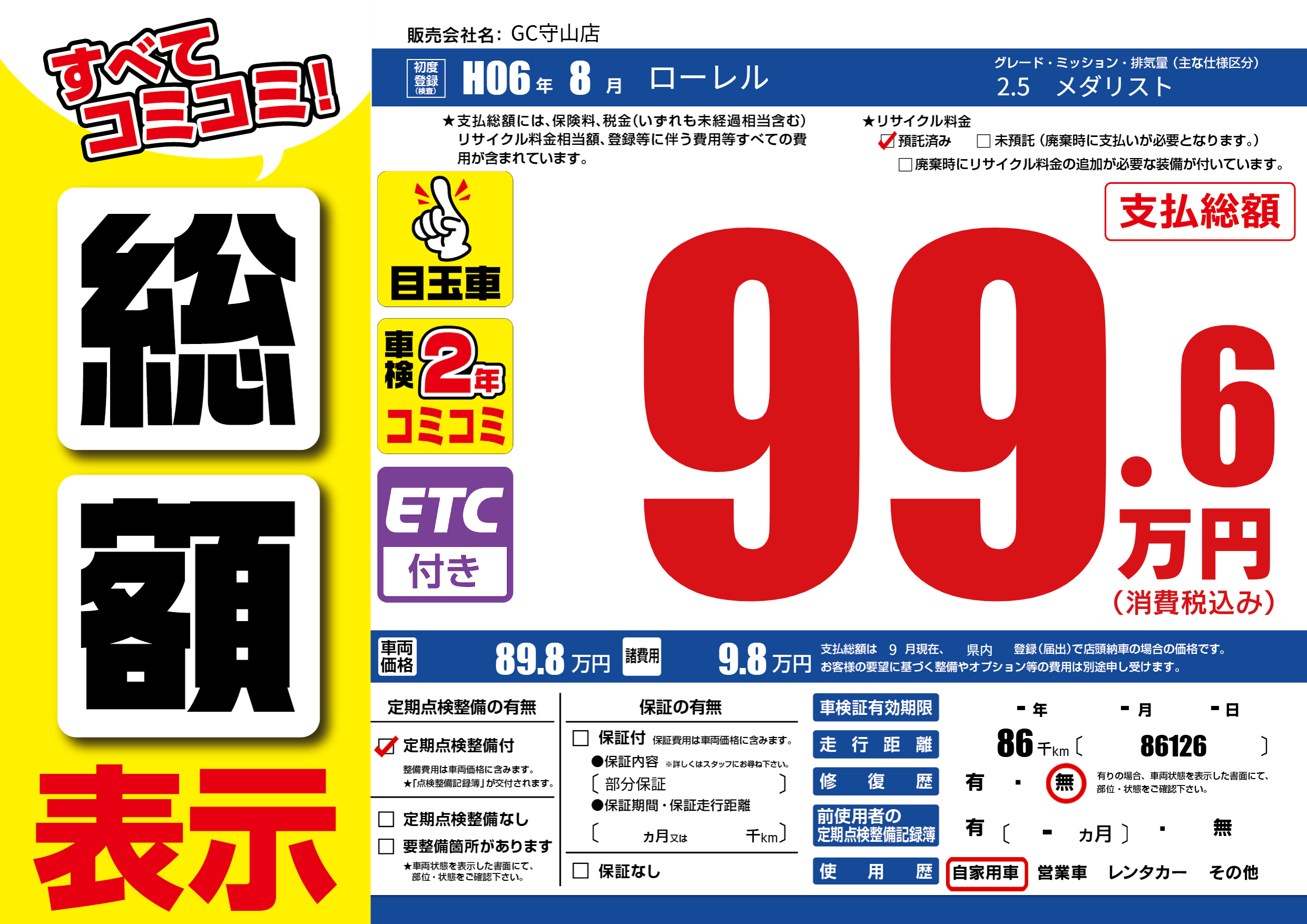 | 走行キロ | 8.6万km | 初年度登録 | H06年8月 |
