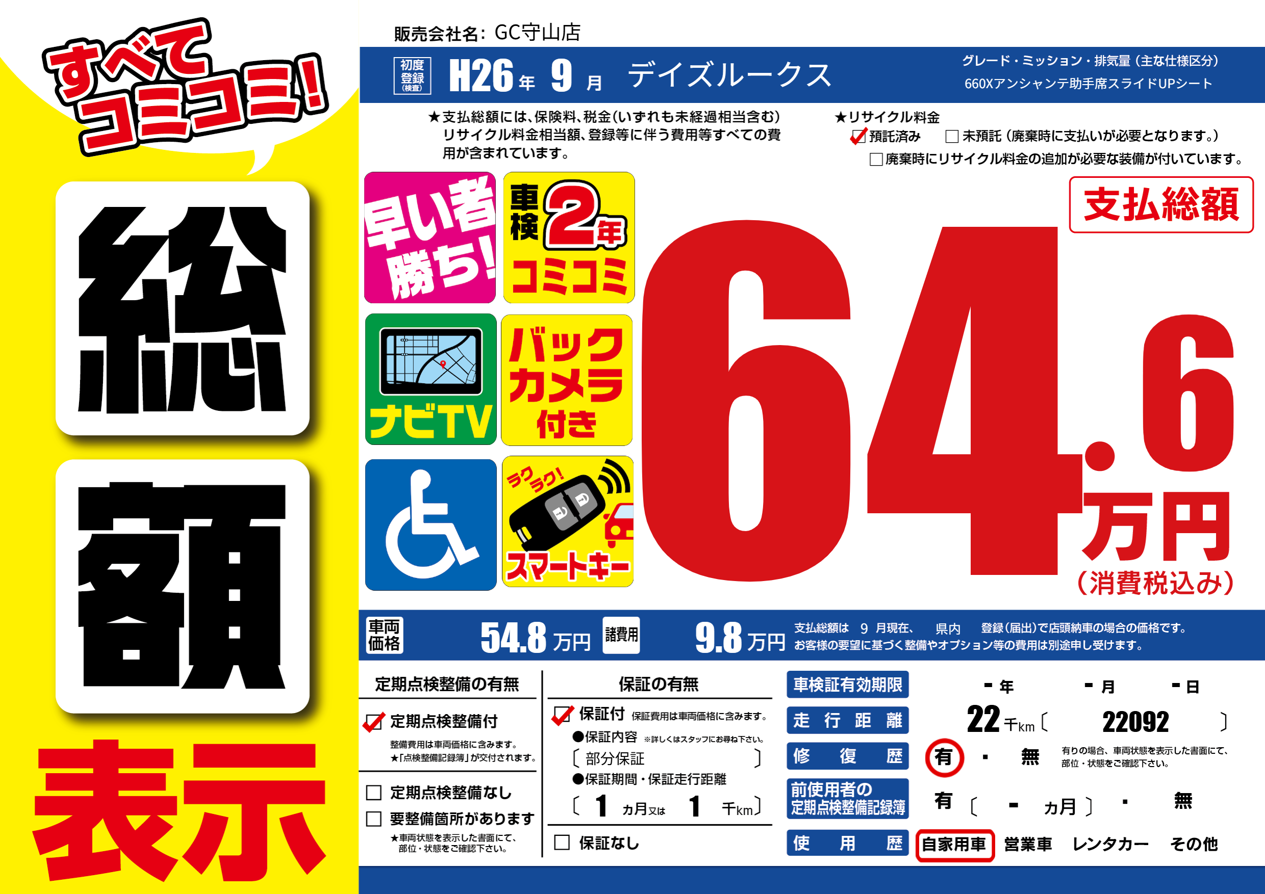 | 走行キロ | 2.2万km | 初年度登録 | H26年9月 |
