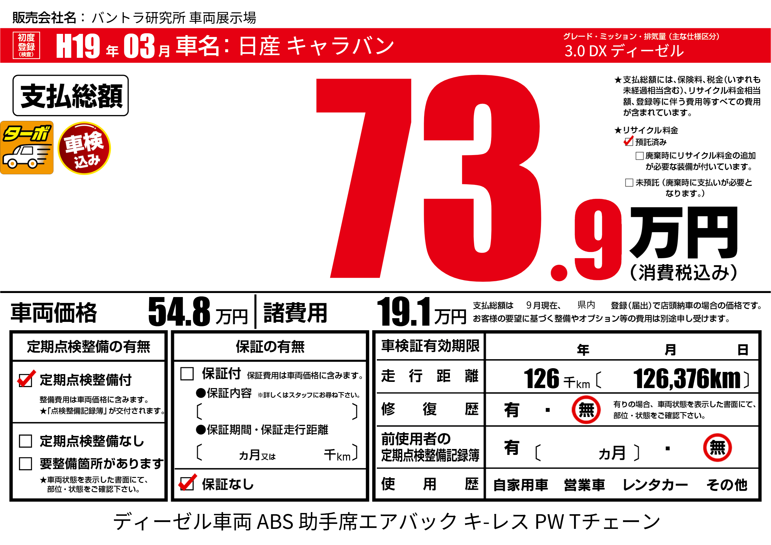 | 走行キロ | 12.6万km | 初年度登録 | H19年03月 |
