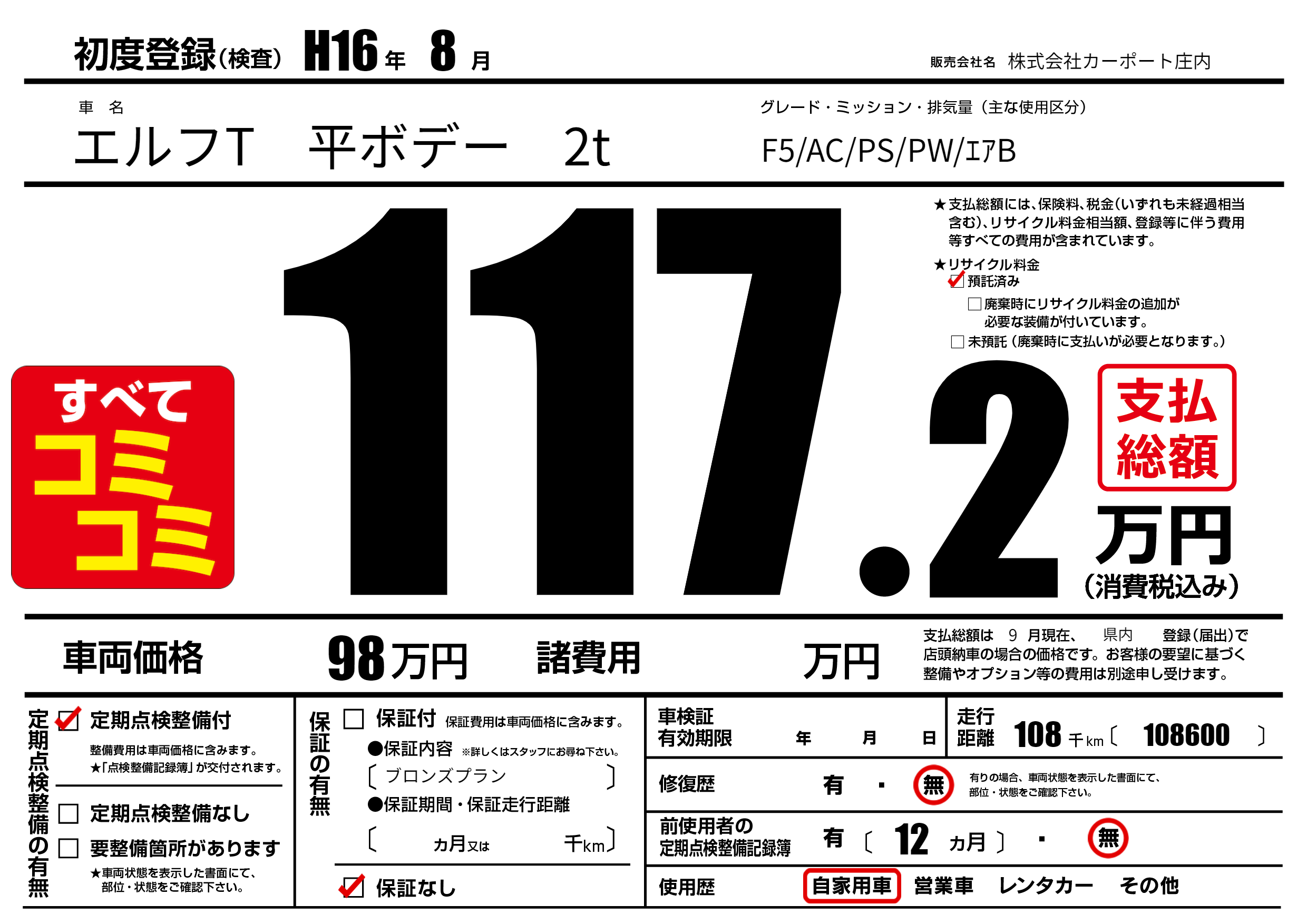 | 走行キロ | 10.8万km | 初年度登録 | H16年8月 |