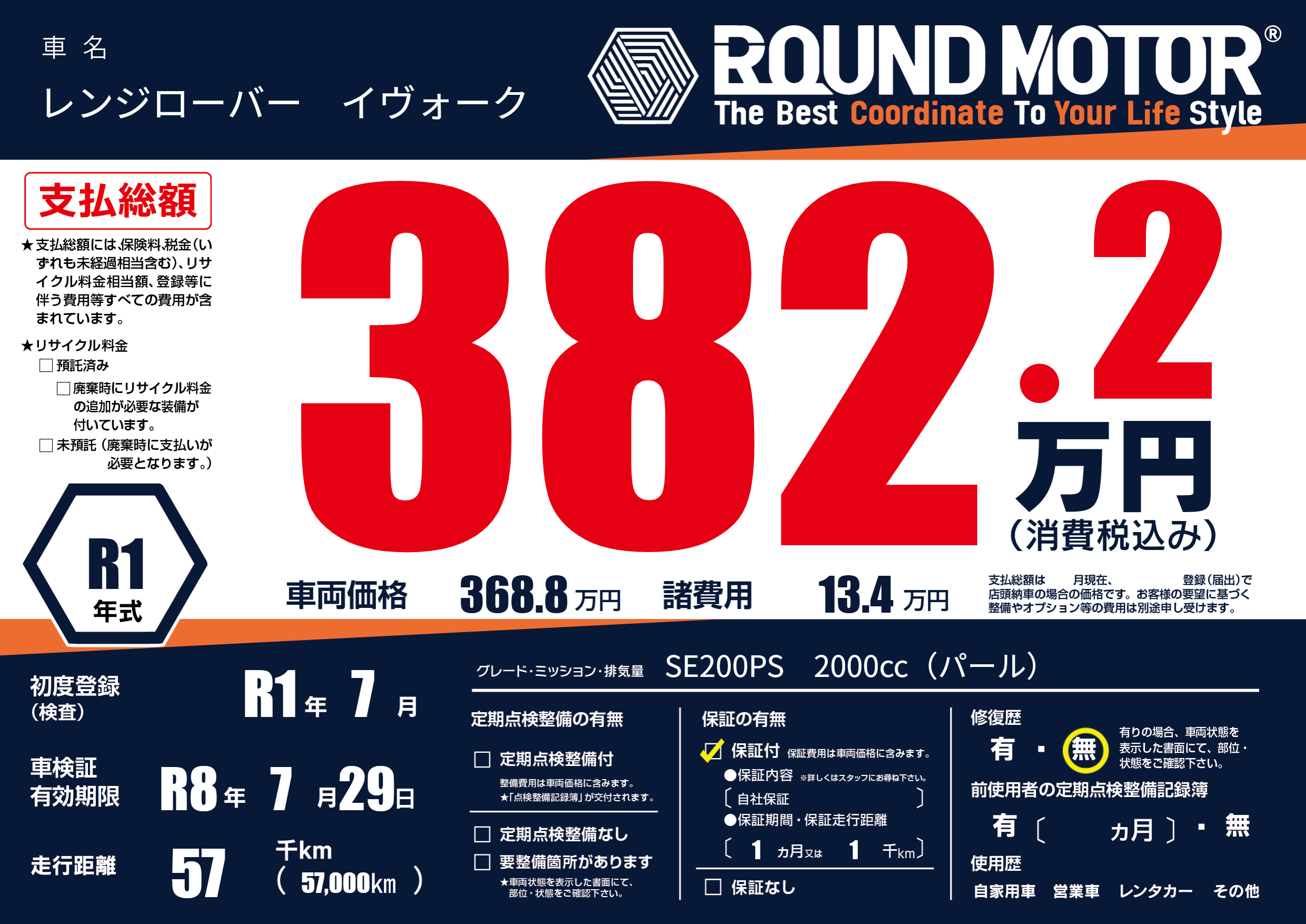 | 車名 | レンジローバー イヴォーク | グレード ミッション 排気量 |