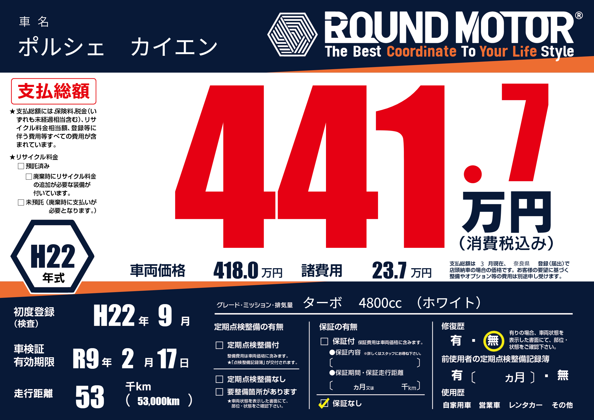 | 車名 | ポルシェ カイエン | グレード ミッション 排気量 |