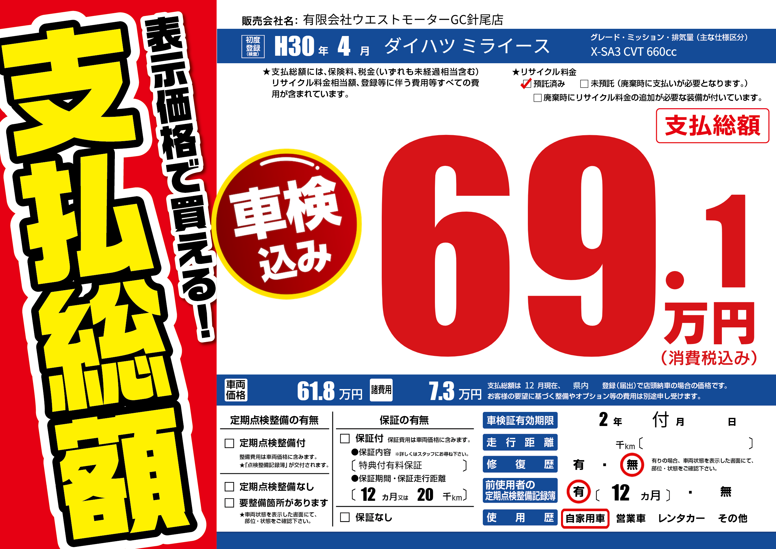 | 車名 | ダイハツ ミライース | グレード ミッション 排気量 |
