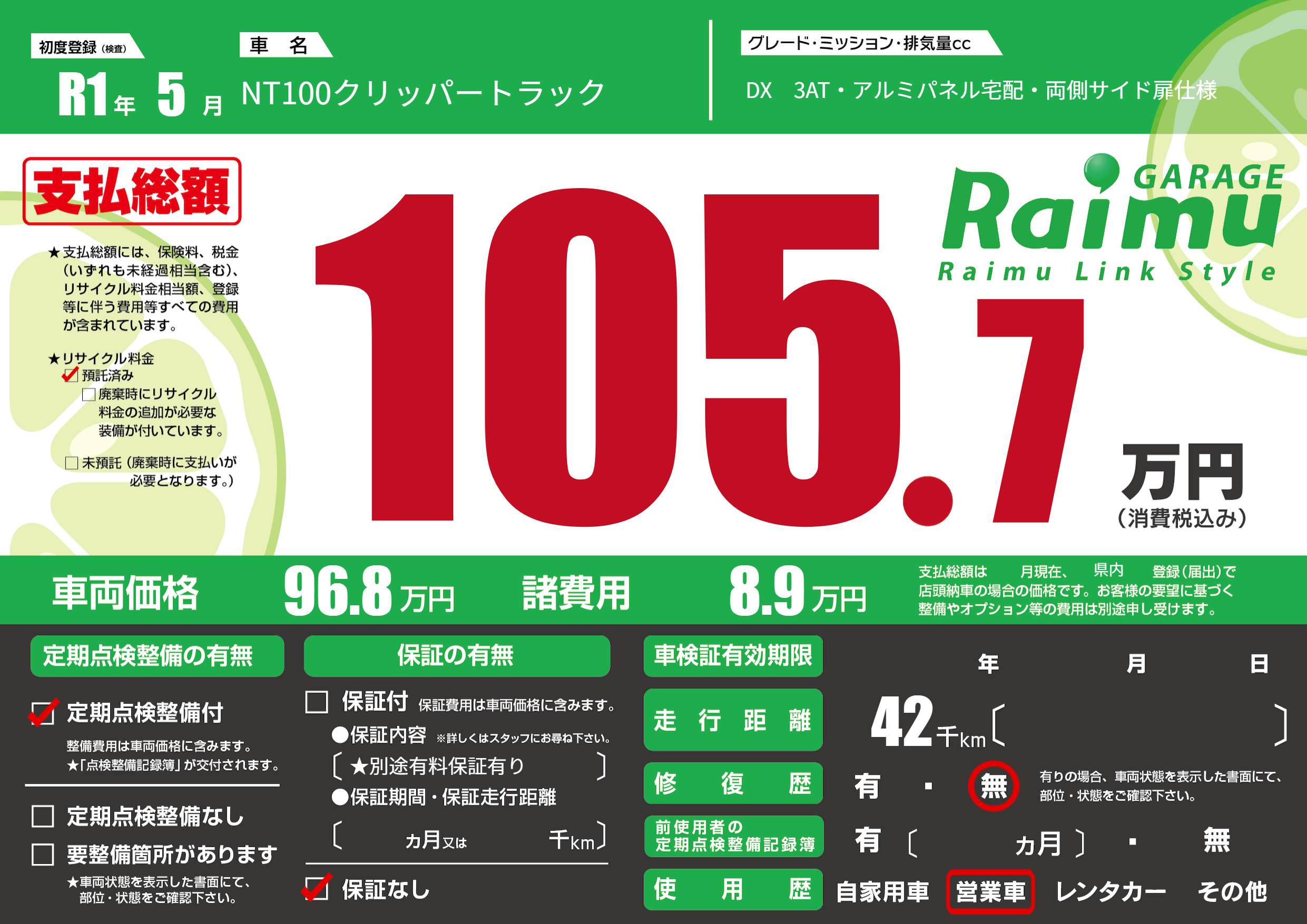 | 車名 | NT100クリッパートラック | グレード ミッション 排気量 |