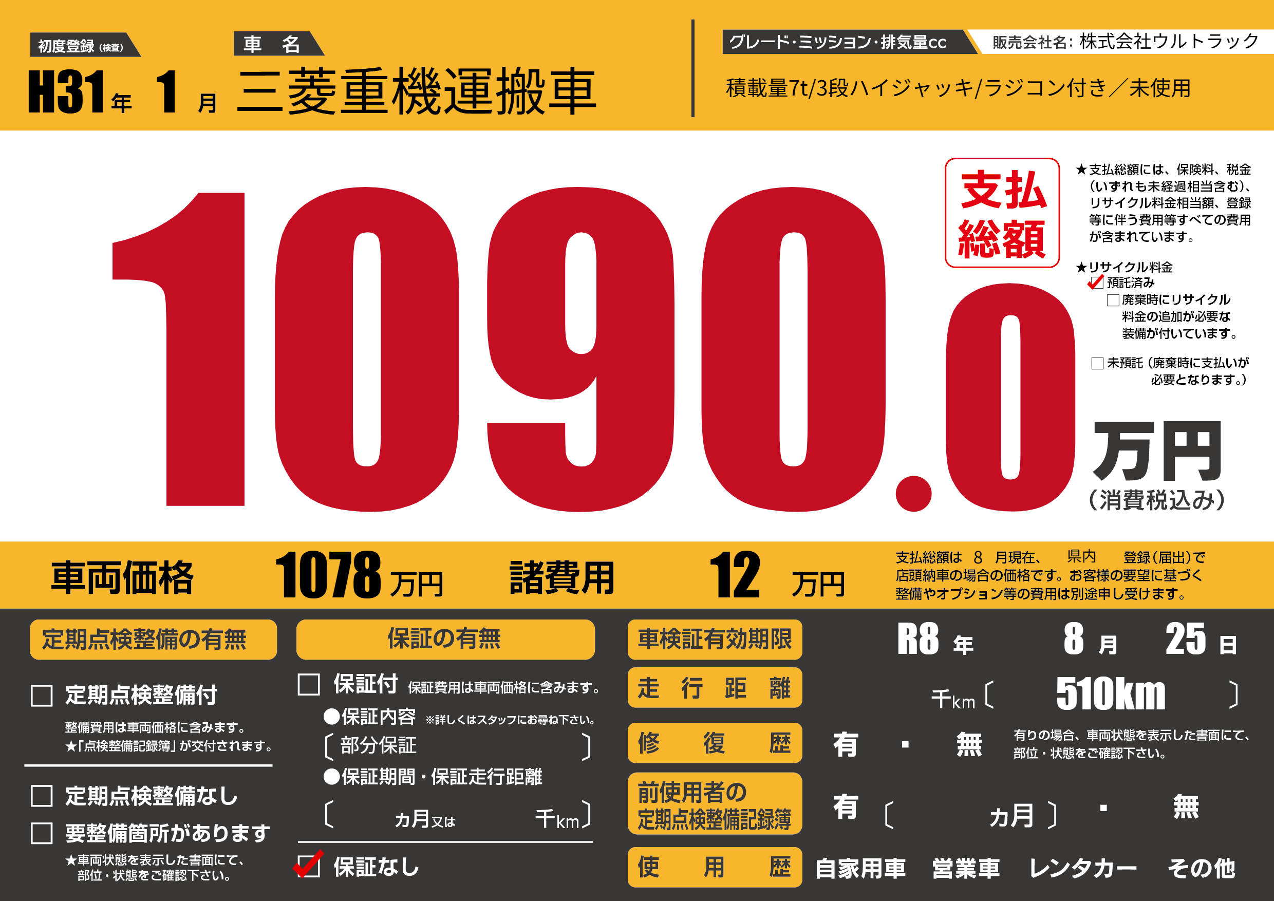 保証なし 保証内容(部分保証) ---ヶ月または()千kmまで |