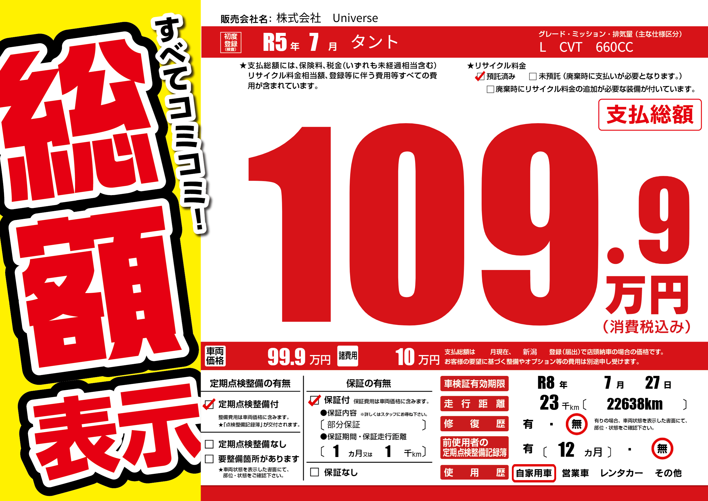 | 走行キロ | 2.3万km | 初年度登録 | R5年7月 |