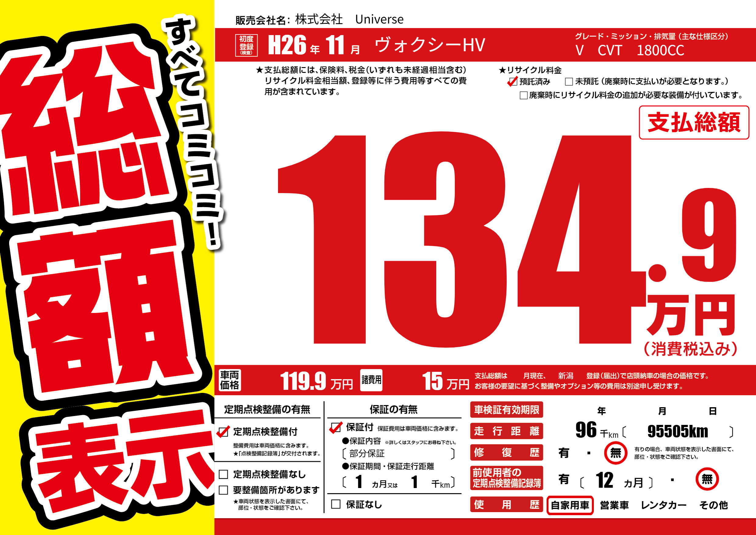 | 走行キロ | 9.6万km | 初年度登録 | H26年11月 |