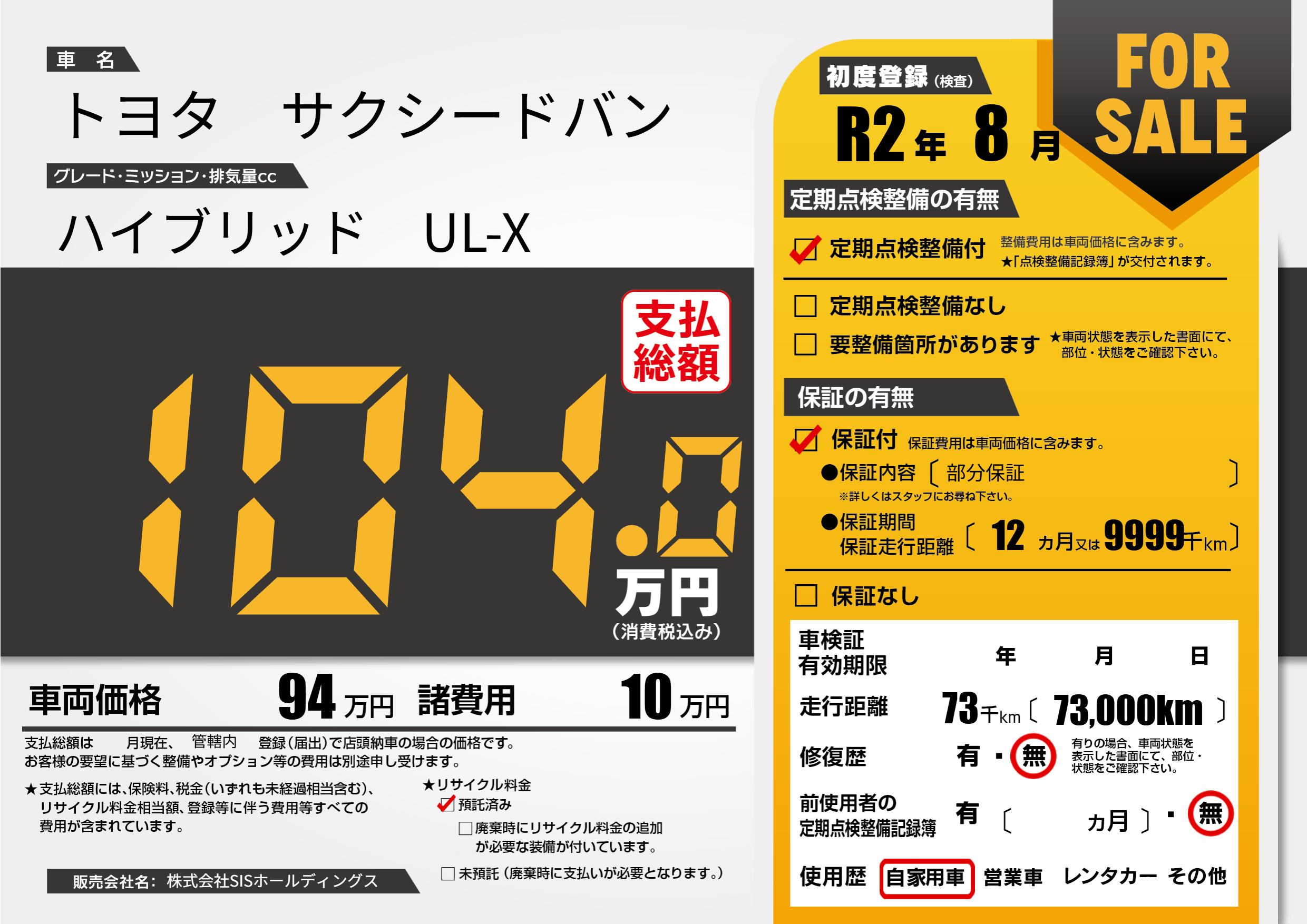 保証付き 保証内容(部分保証) 12ヶ月または(9999)千kmまで |