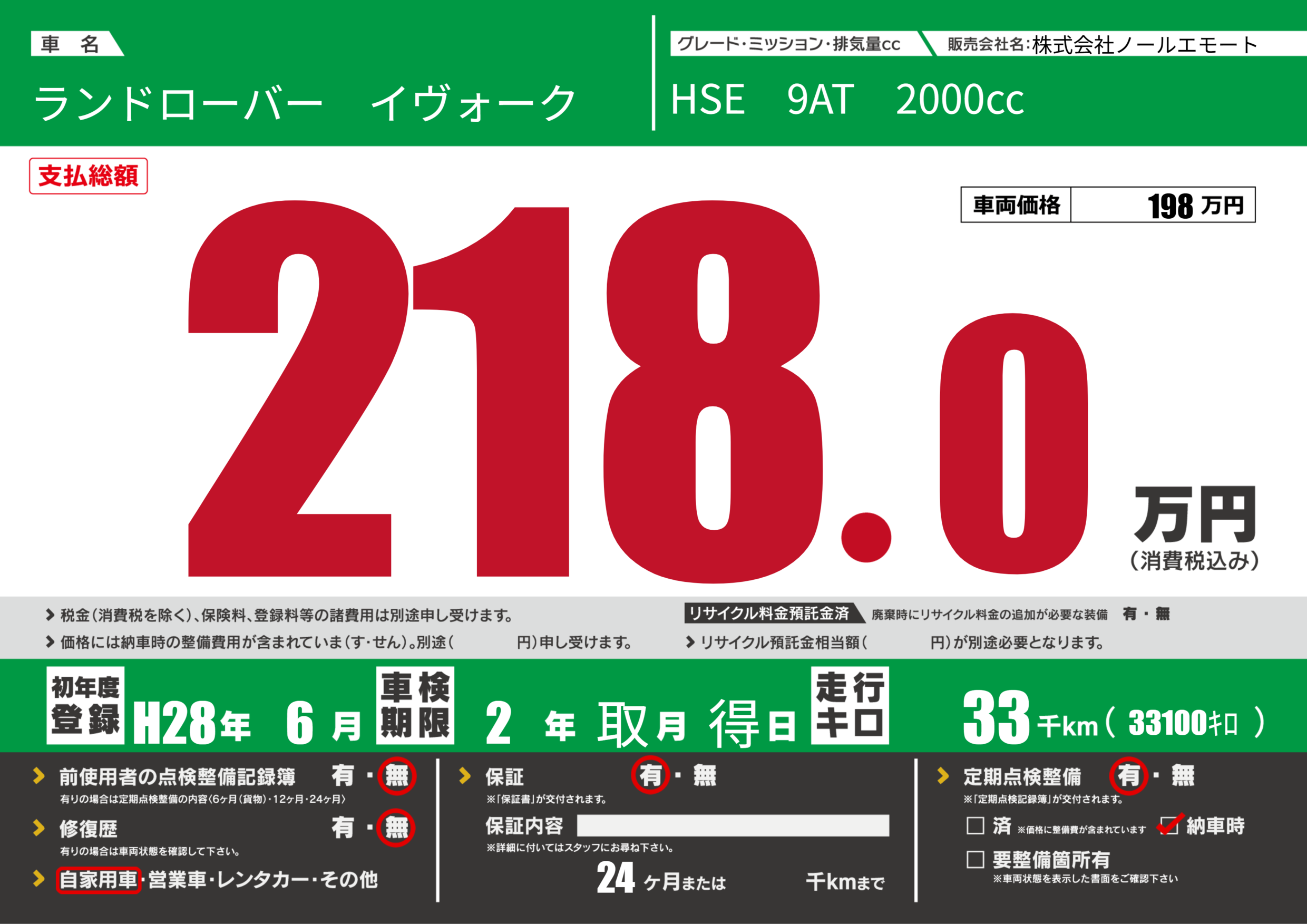 保証付き 保証内容(---) 24ヶ月または()千kmまで |