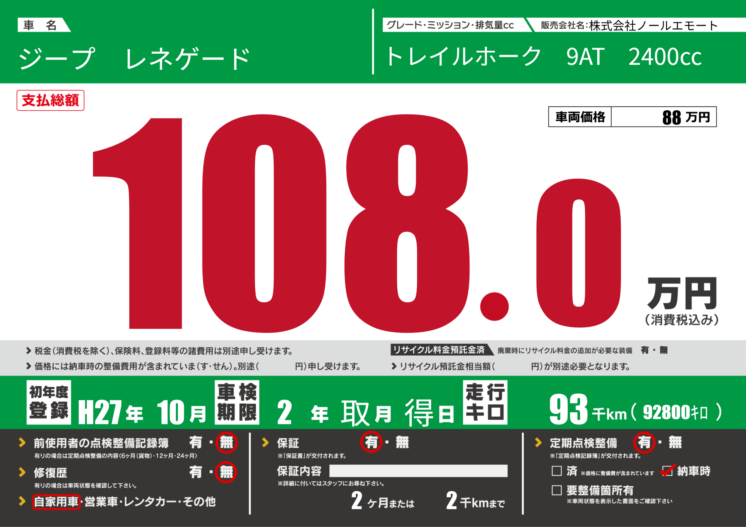 保証付き 保証内容(---) 2ヶ月または(2)千kmまで |