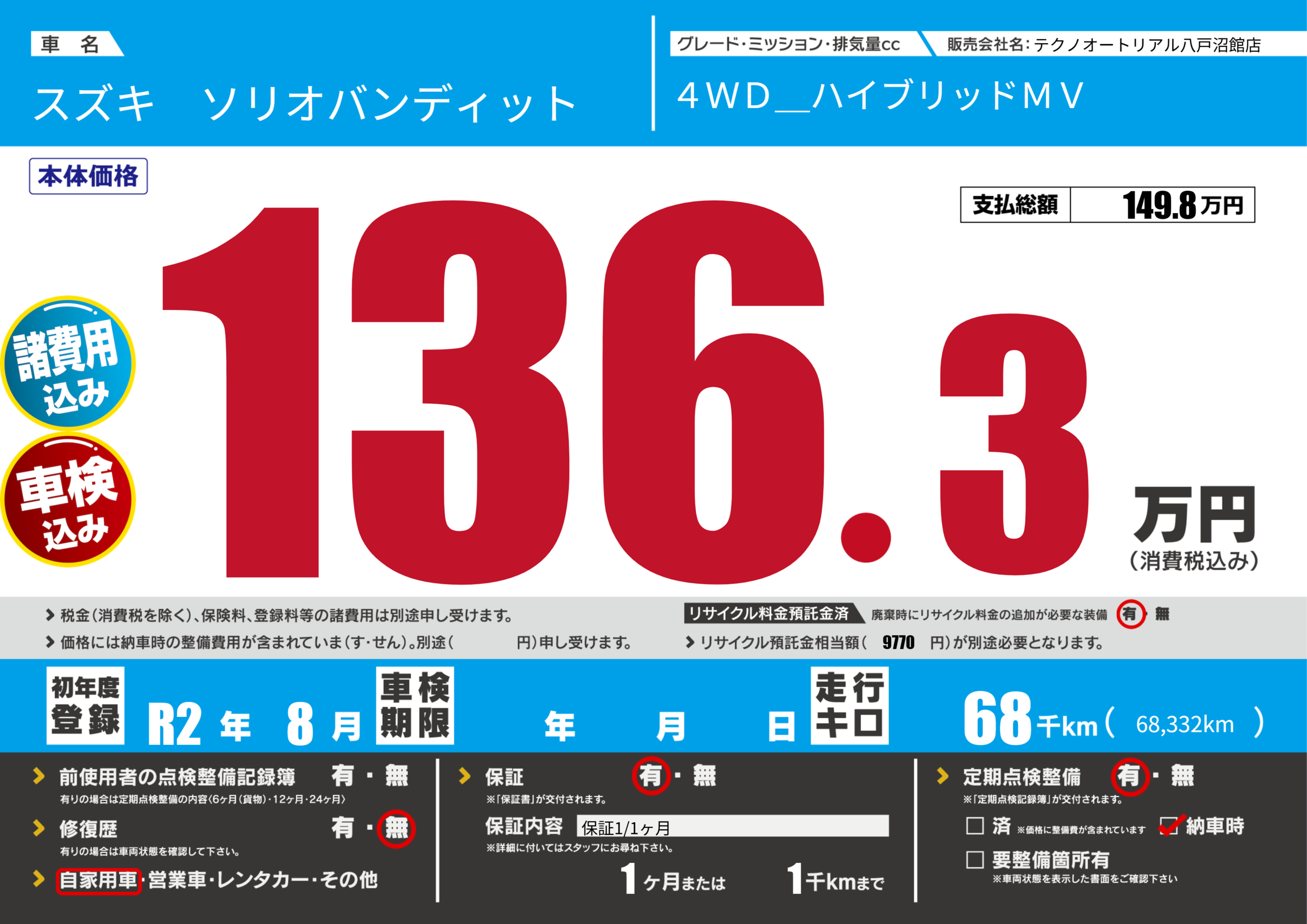 | 走行キロ | 6.8万km | 初年度登録 | R2年8月 |