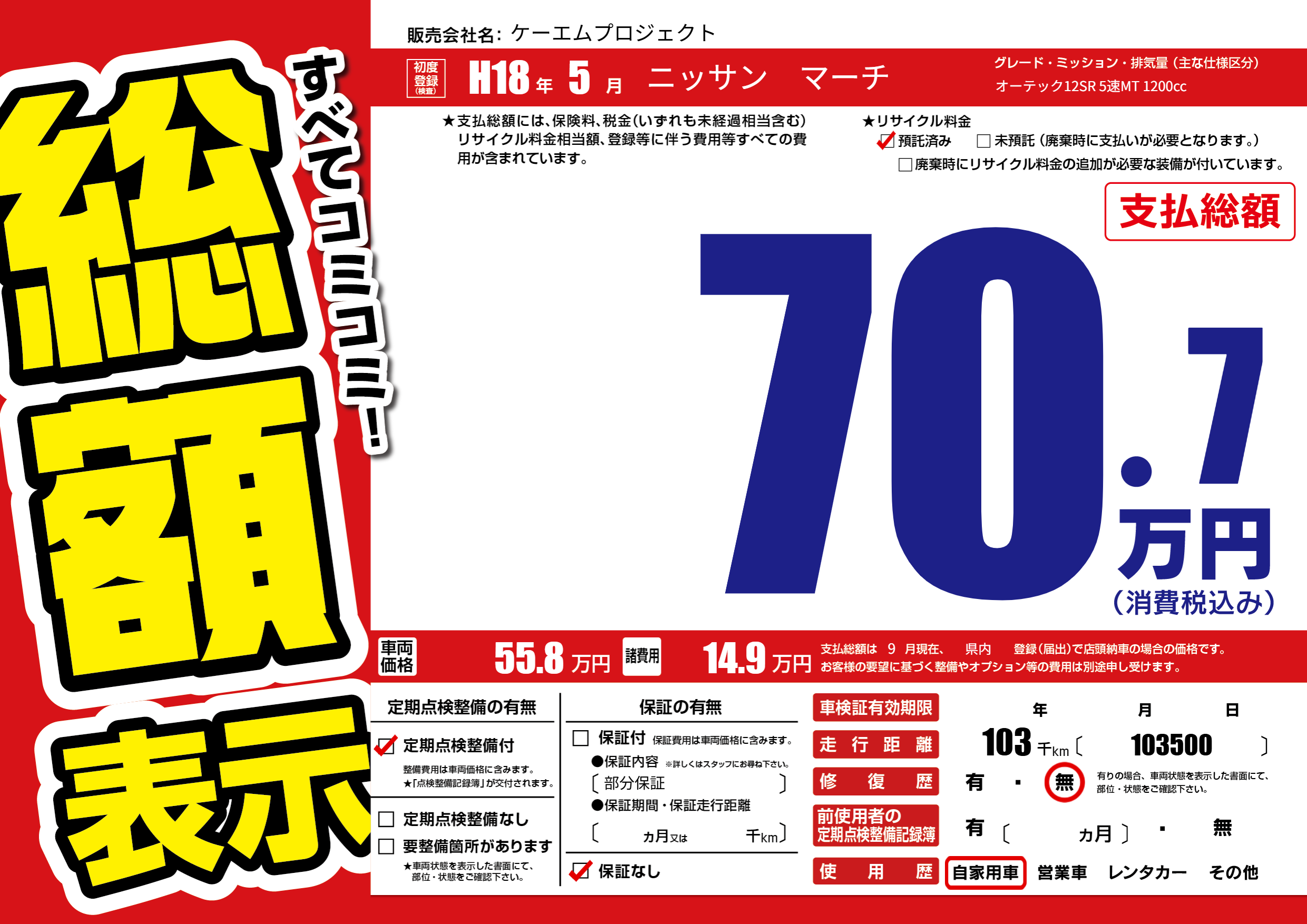 | 車名 | ニッサン マーチ | グレード ミッション 排気量 |